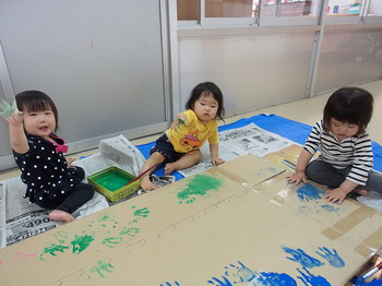 手に絵の具をつけ、大きいダンボールに手型スタンプをします。