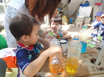 かき混ぜたりすくったりして、カラフルな色を楽しみました。