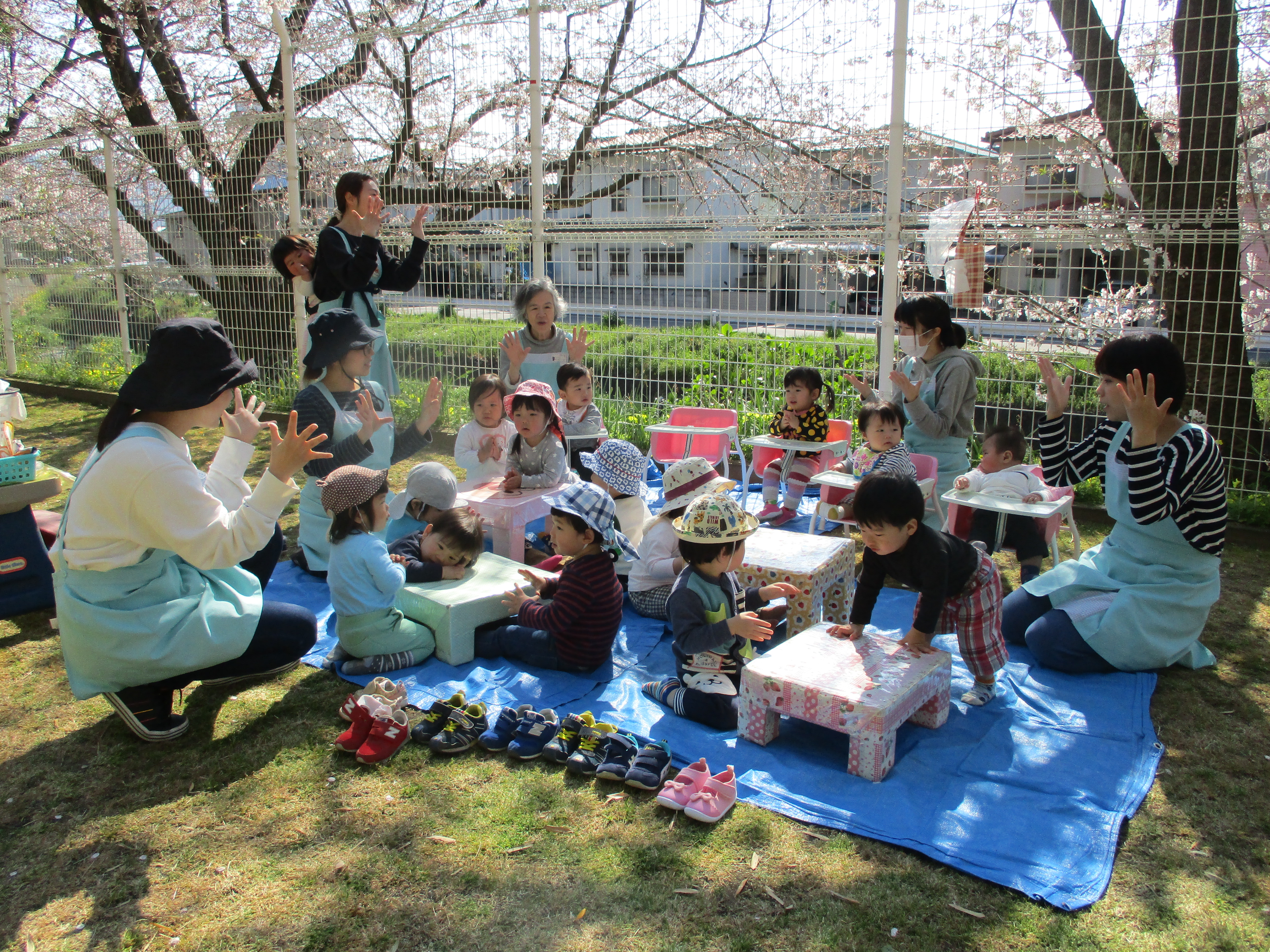 桜の木の下でブルーシートを敷いて、お花見です!