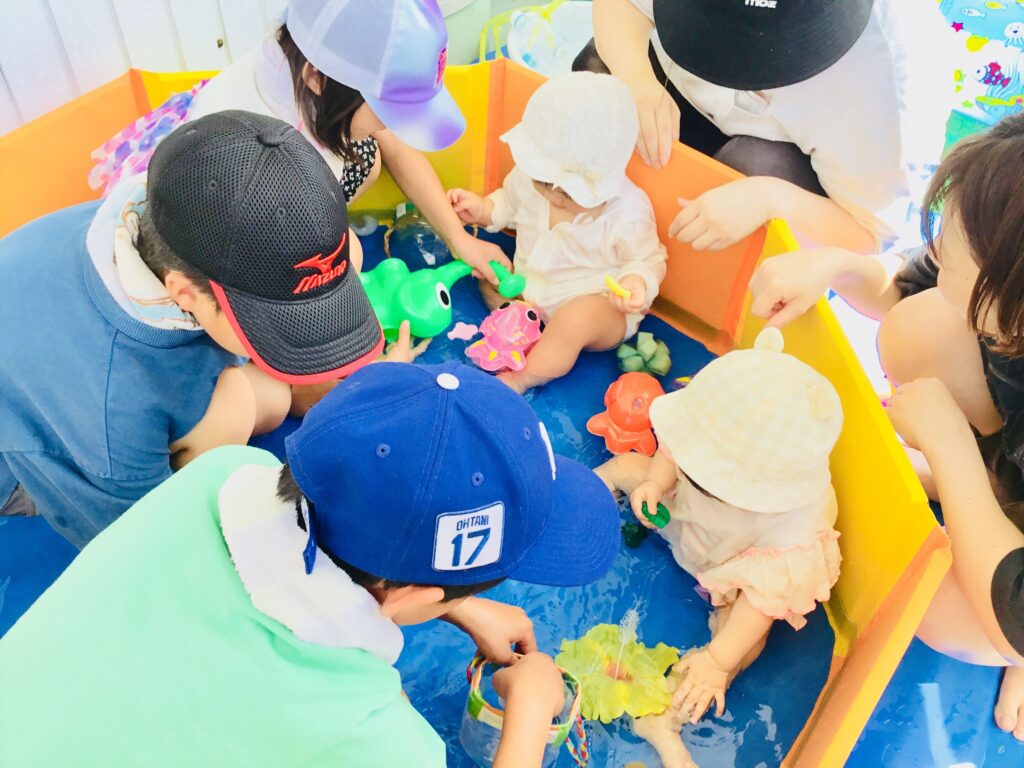 小学生も一緒にプールの中に入り、声をかけて遊んでくれましたよ。さぁ、どんな遊びをするのかな?わくわく。ドキドキ(^^♪