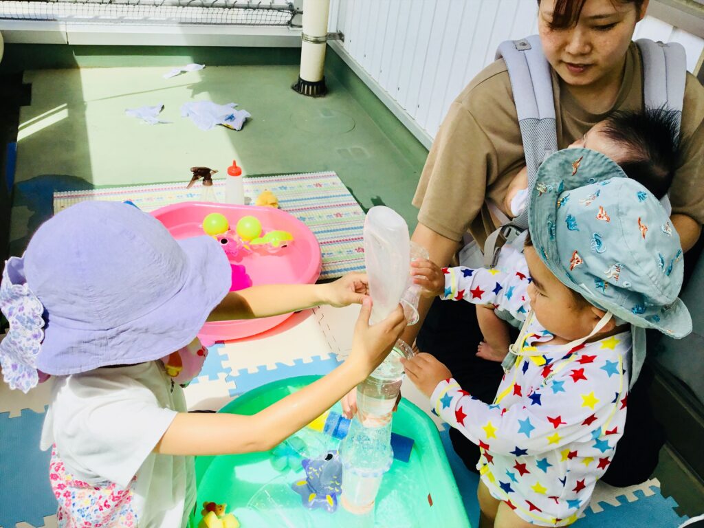 当園には、児童クラブがあります。小学1年生~3年生の児童がいます。今日は、小学生のお兄ちゃん、お姉ちゃん4名と一緒に水遊びを楽しみました。