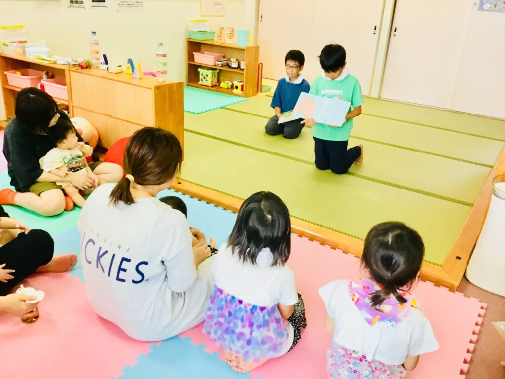 丁寧に一生懸命読んでくれるので皆、興味を示しながら集中して見ている姿が印象的でした。小学生にとって、小さな子ども達と関わる体験は新鮮で貴重な体験になったように感じます。今日一緒に遊んだ小学生の中には、小さい頃子育て支援センターを利用していた子もいます。家庭で小さい頃子育て支援センターで過ごした思い出を家族に聞いて思い出を振り返るのもいいですね。