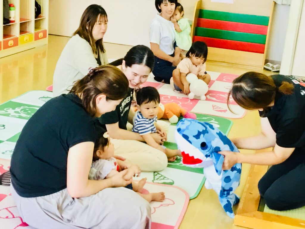 皆で、「Baby Shark」の歌を振りを付けて歌って楽しみました。園でも、お帰りの時に流れている子ども達に大人気の歌です。講師の表現を真似して、体を動かして遊びました。