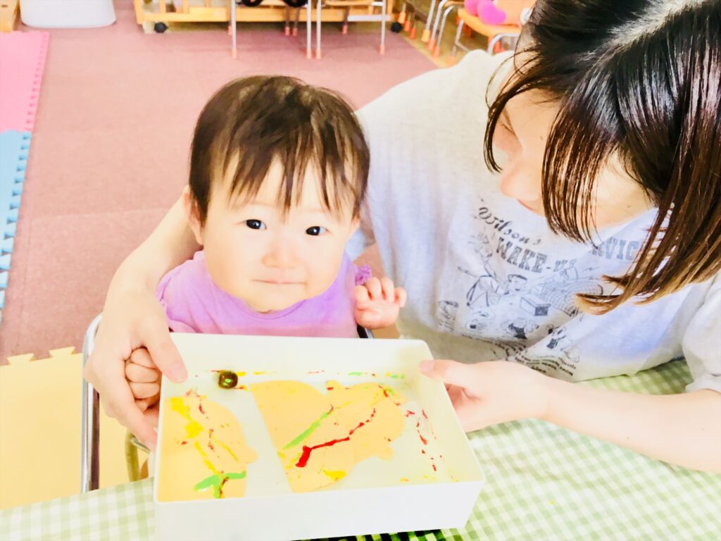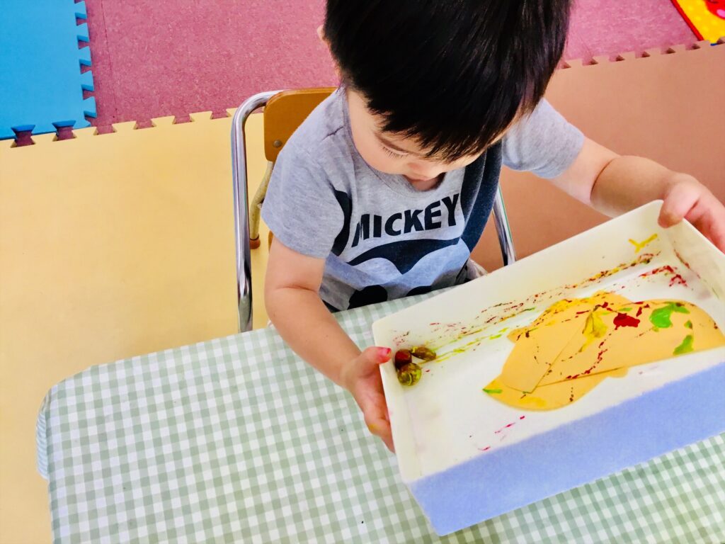 どんぐりに絵の具をつけて・・・・箱に入れて傾けると「うわぁ~。どんぐりころころ♬だぁ!!」