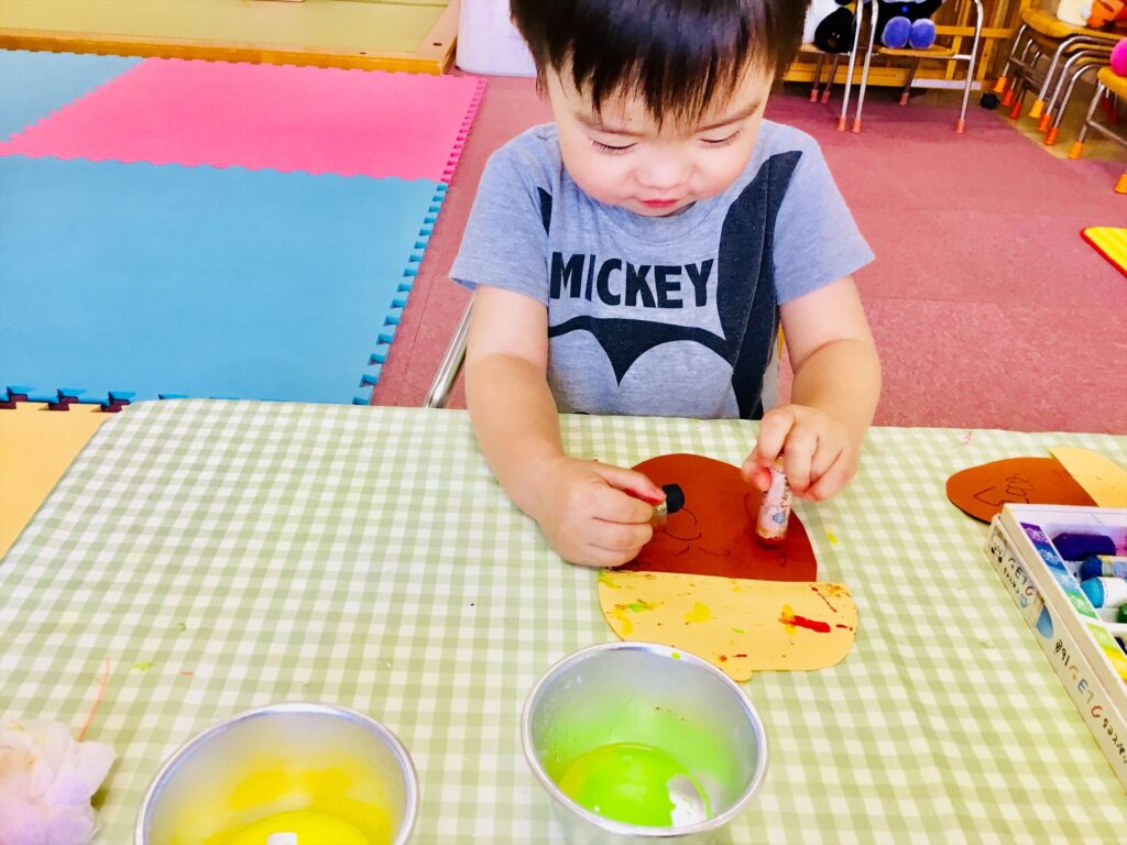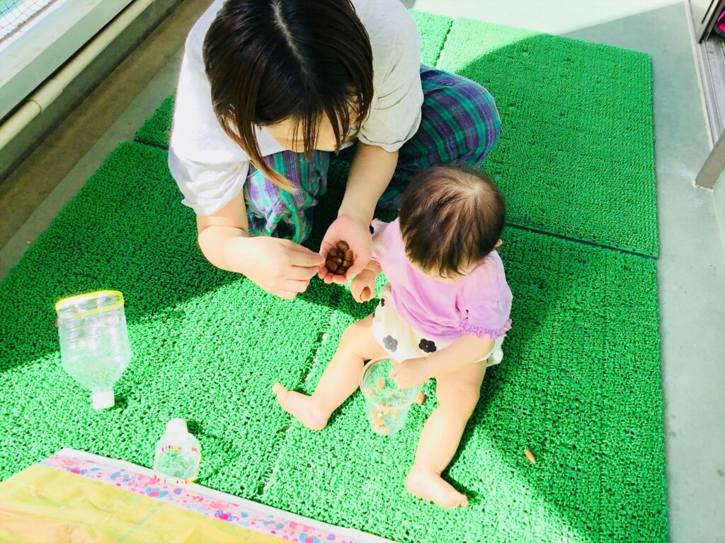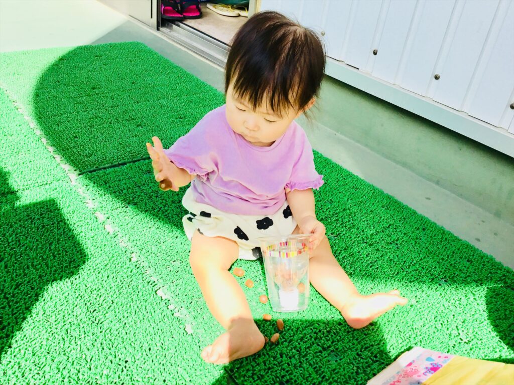 指先を使って、どんぐりをつまんでいますよ。透明コップにどんぐりを落とすと、コロン♪と音がするので、興味を示して繰り返し遊んでいました。少しずつ秋の自然に触れながら遊びましょう。