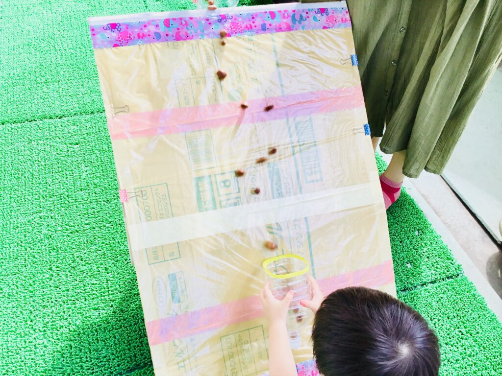 テラスでは、転がしボ―ドが登場!!転がしているのは、なんと!!どんぐりです。上からころころ~と転がり落ちてくるのをペットボトルのコップでキャッチ!!