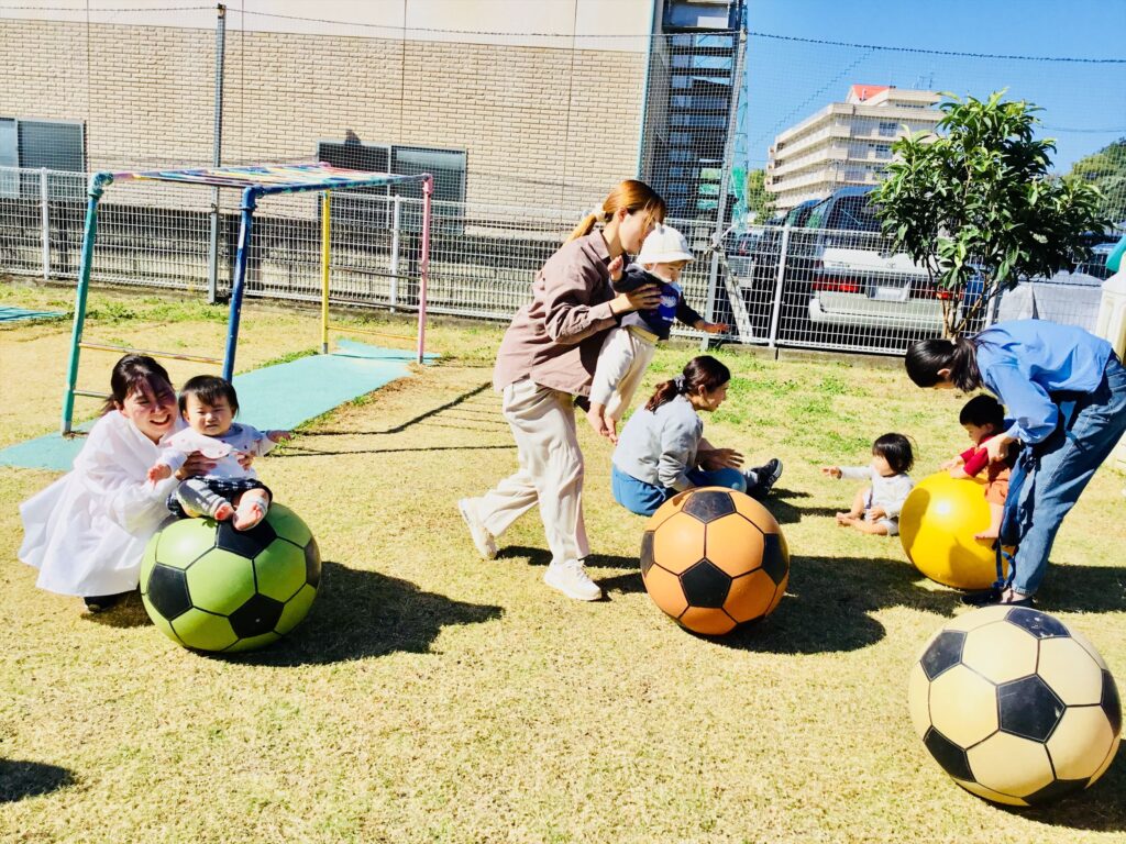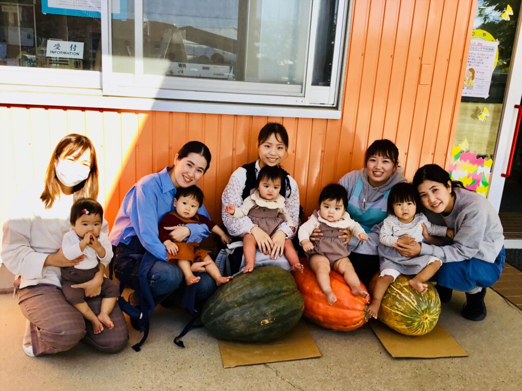 子育て支援ブログ Top 子育て支援 子育て支援ブログ 大きなかぼちゃ☆ 赤ちゃん広場の後、広場に移動していると・・・「うわぁ~。大きいねぇ。」 なんと!!大きなかぼちゃが園の玄関に飾ってありました。 かぼちゃの椅子に座ってにっこにこ~(^^♪ 大きなかぼちゃに興味を示して、触れて楽しみました☆ 広場では、大きなボールに乗ったり、転がしたり・・・ごろん。ごろん。ごろりんこ。 裸足で、ハイハイもしていましたよ。天気が良い日の午前中は戸外で遊んでいます。陽射しを浴びながら元気に過ごしましょう。親子共に帽子と水分補給を忘れずにお持ち下さい。 2025.10.29