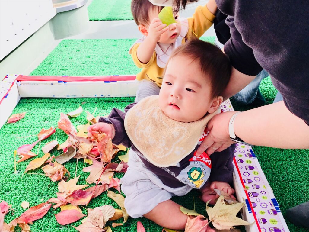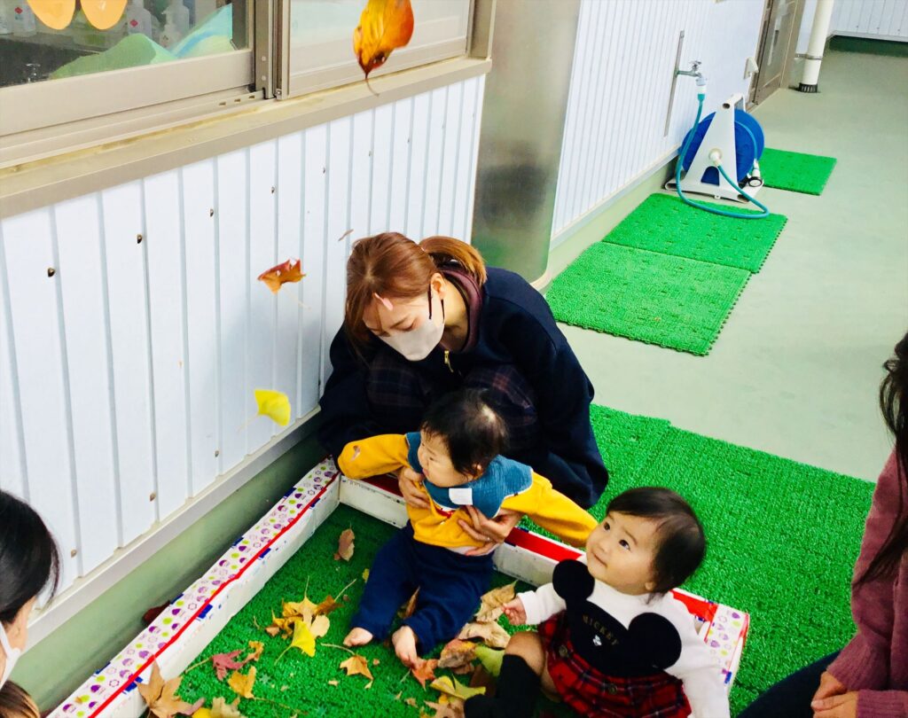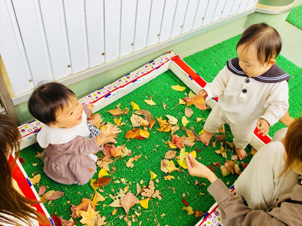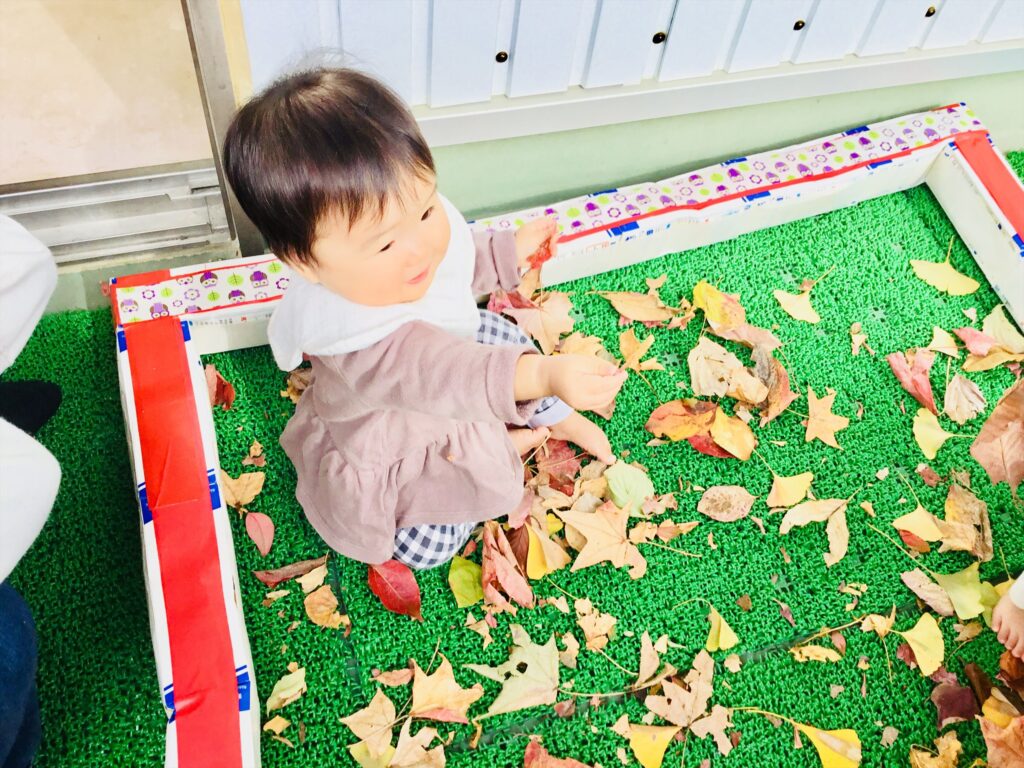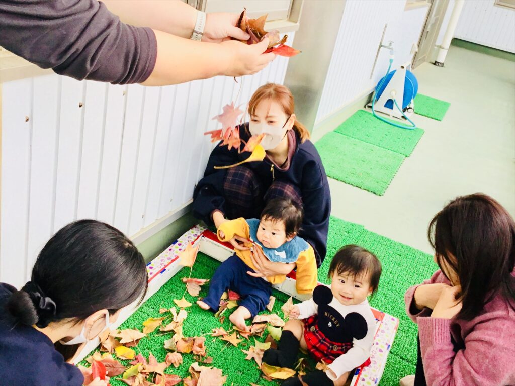 子育て支援ブログ Top 子育て支援 子育て支援ブログ ひらひら落ち葉きれいだね♬ いちょうや、もみじ等黄色や赤色に色づいた落ち葉のシャワー。 「ひらひら~。」いろいろな色の葉っぱが落ちてきて「きれいだね。」 落ち葉をにぎにぎ。乾燥した葉っぱは、パリパリと音がして一瞬で粉々に。 落ち葉の形や色に興味を示して、ちぎって遊ぶお友達もいましたよ。 日に日に寒くなってきていますが、もう少し秋の季節を感じながら遊びましょう♬ 2025.11.05