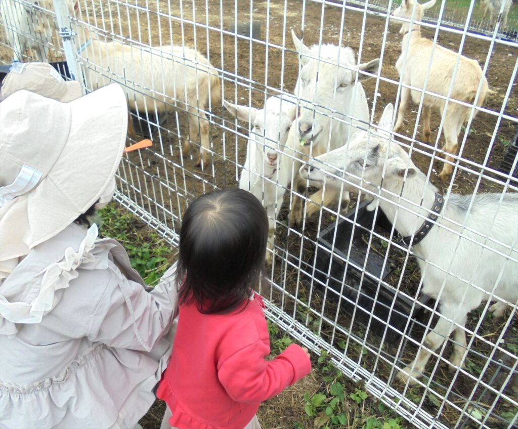次は、ヤギに餌やり体験です。「ご飯ですよ。」と、そうっと人参を差し出すと、パクパクと食べてくれましたよ。