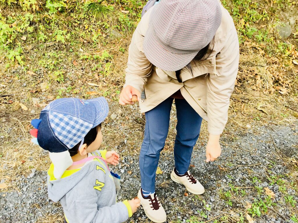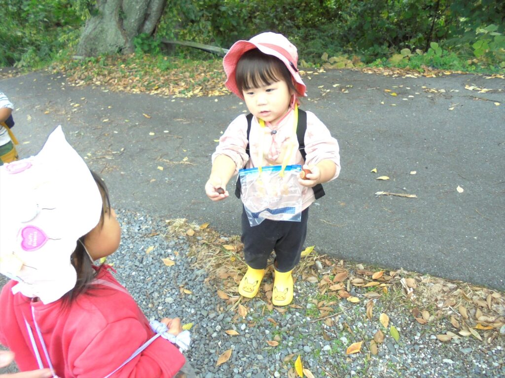 大きなどんぐりが落ちてるよ。お友達に見せてあげて、仲良くどんぐり拾いを楽しんでいました♪