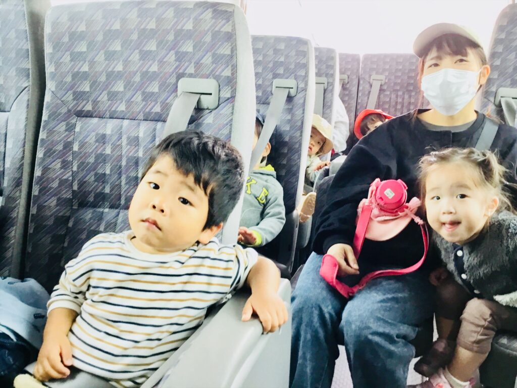 さぁ、バスに乗って出発!!バスの中では、絵本「おいもさんがね」の読み聞かせをしました。「どんなお芋が取れるかな?」「大きいお芋を取るよ。」と、とても楽しみな子ども達。