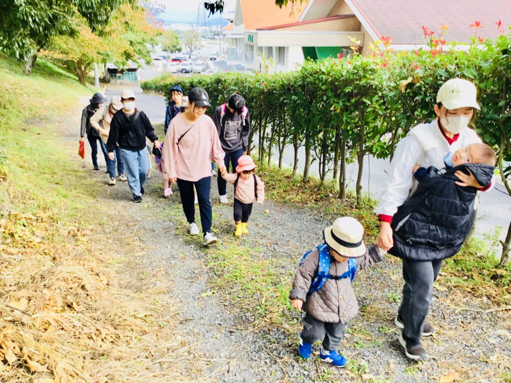 11月11日(火)、「森のこども園」を行いました。今朝から一段と気温が下がり、冷たい風を感じる日でしたがお出かけ日和の良い天気。今回は、アルムの里へお出かけしました♬