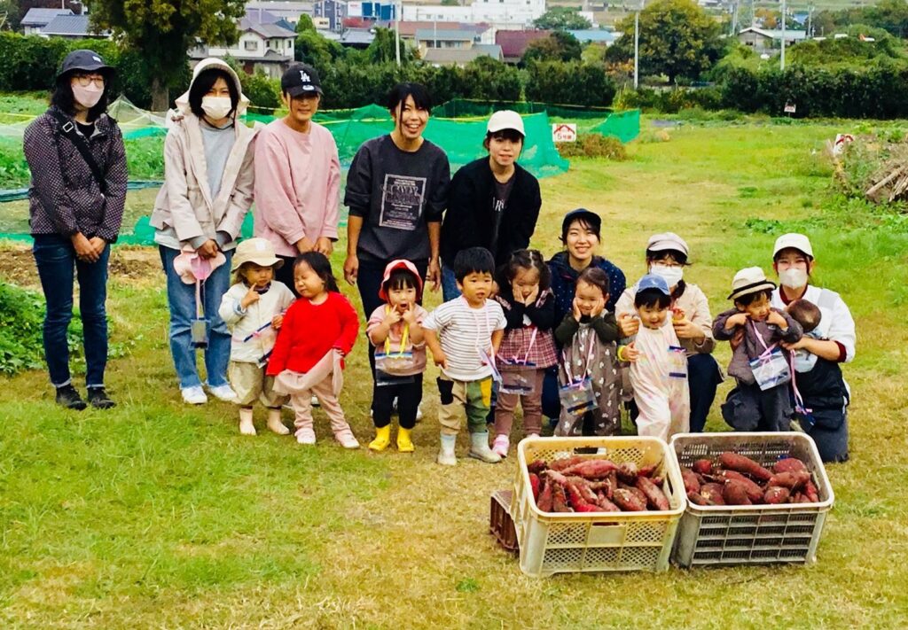 頑張って収穫したお芋の前で記念撮影(^^♪