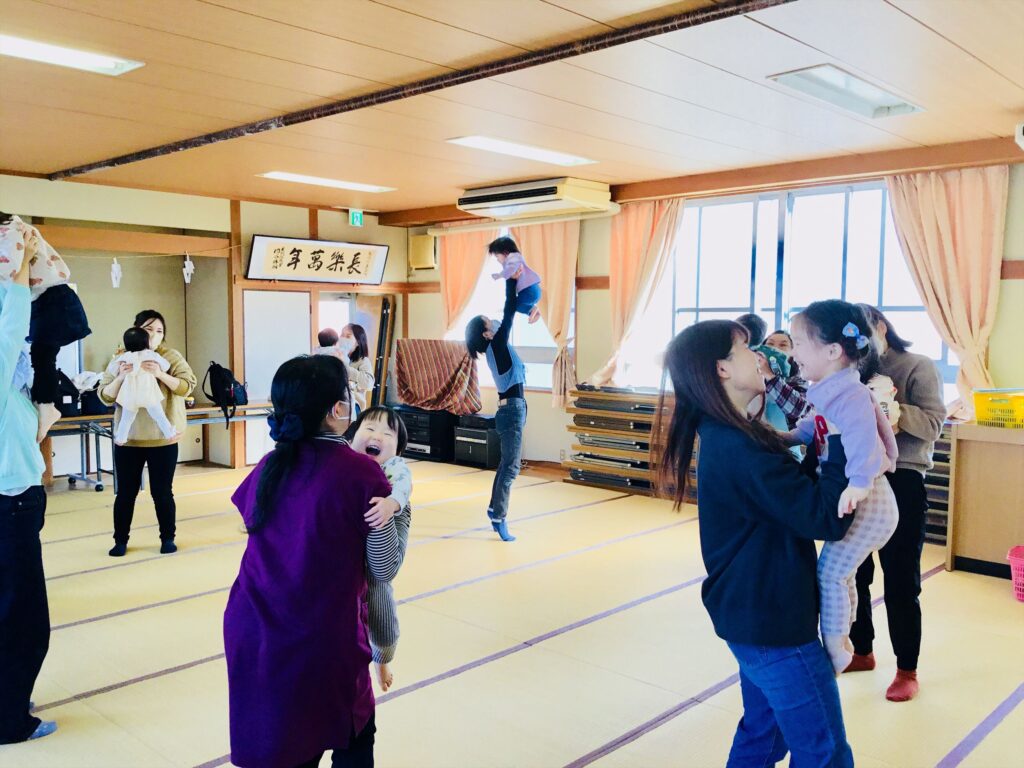 「大人公園」のリズム体操からウォーミングアップ!!お母さんに抱き上げてもらって、「たかい、たかーい!!」笑顔満開(^^♪