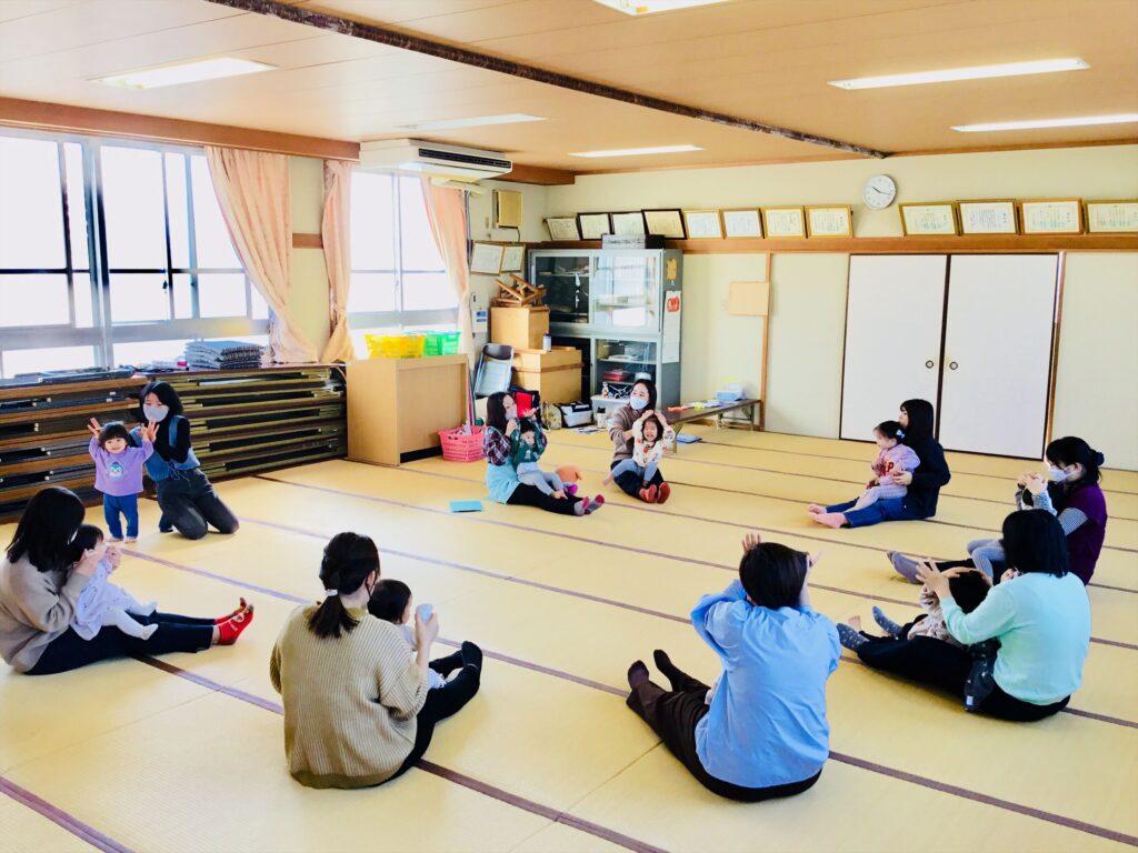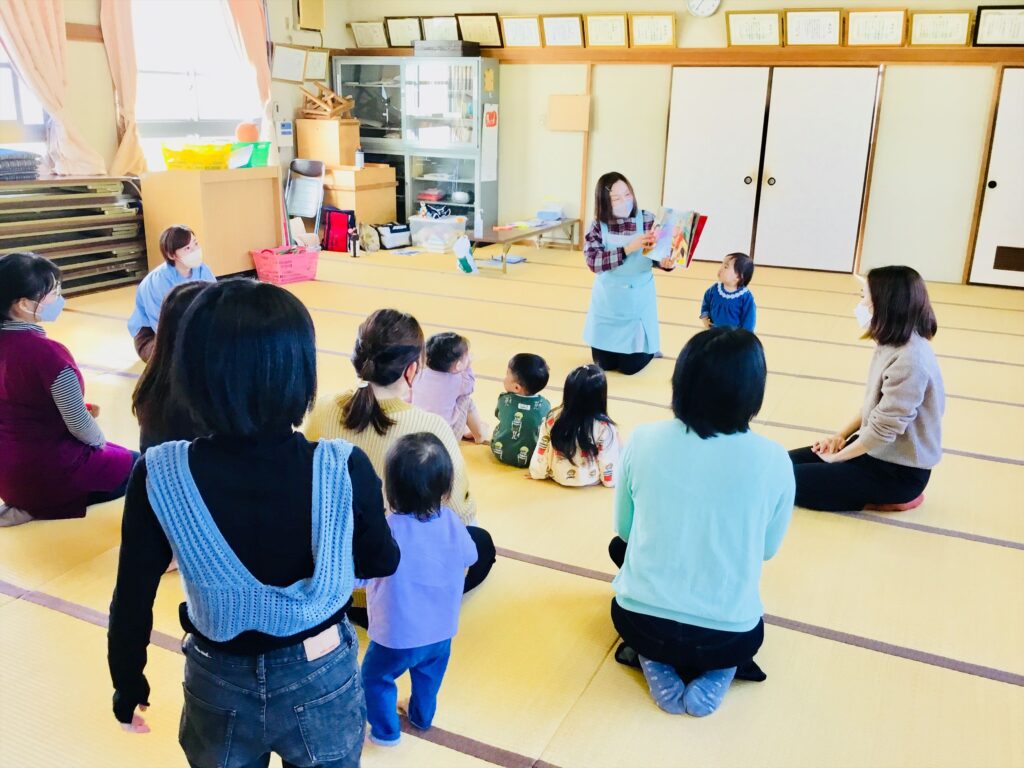 最後は、絵本「きょうのごはん」の読み聞かせです。リアルな絵を見ていると、お腹が空いてきた子ども達。思わず大きく口を開けて食べるしぐさをするお友達もいましたよ。食欲の秋です。美味しいご飯を食べて元気に過ごしましょうね。