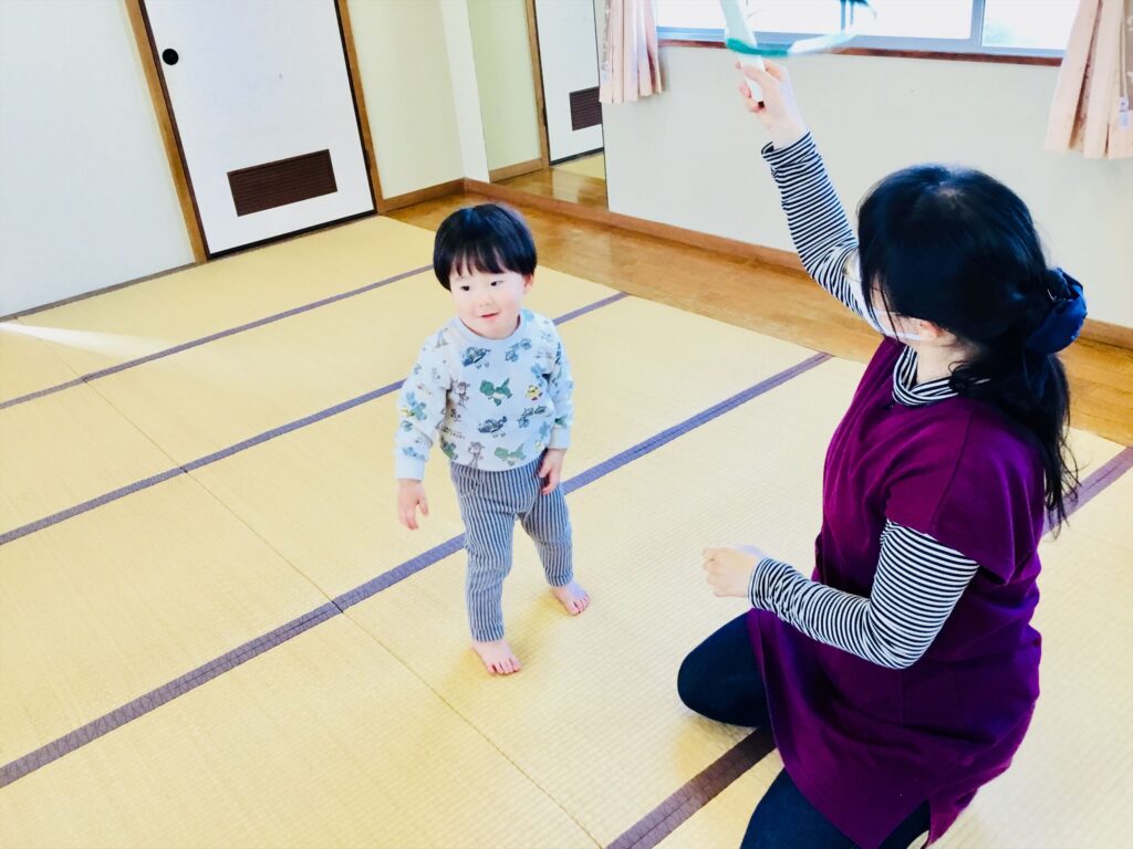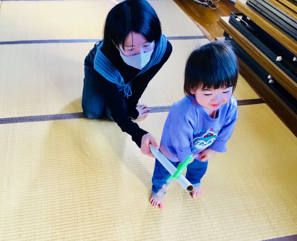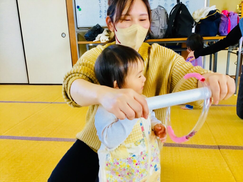 お母さんの差し出す棒をよーく見て、リングが入るとにっこにこ~(^^♪