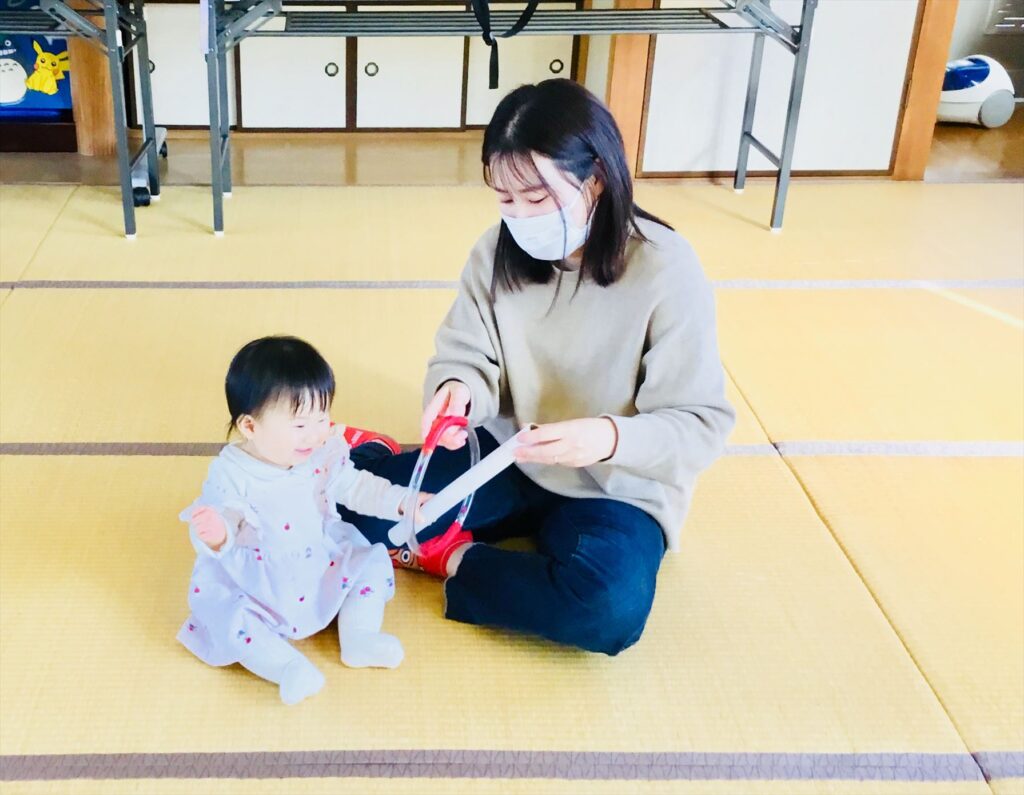 落ち葉に興味を示して楽しんでいる親子が増えてきています。「もみじがひらひら」のふれあい遊びでは、頭にもみじがピタッとくっついたよ。