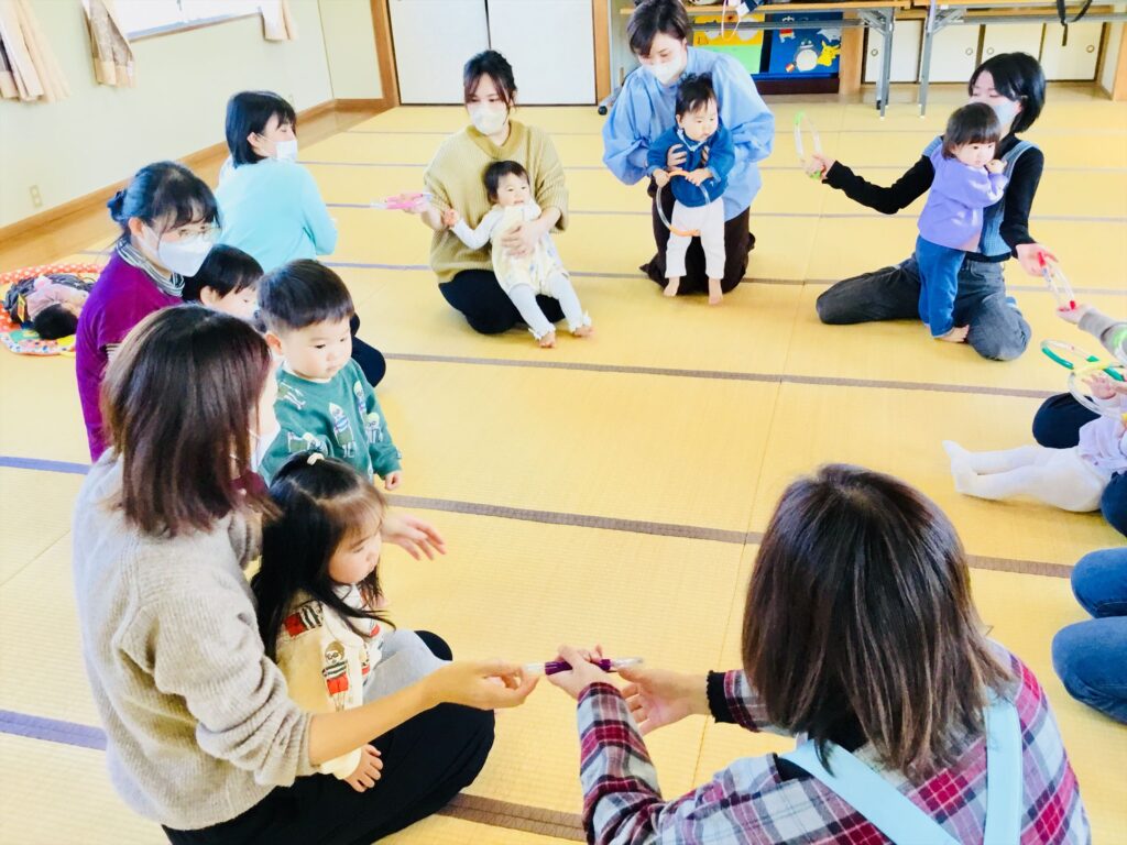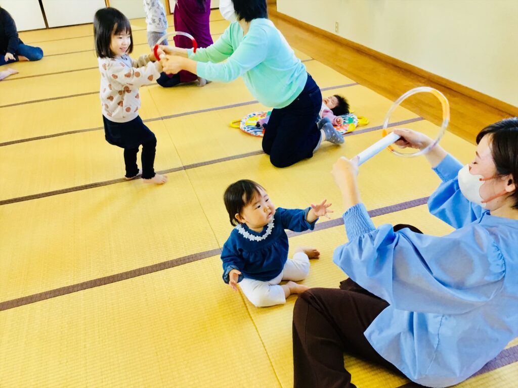 さぁ、ホースリングの登場です!!順番に隣りの友達にリングを渡していきますよ。「はい、どうぞ。」「ありがとう。」お友達の顔を見ながら丁寧に受け渡しを楽しみました。
