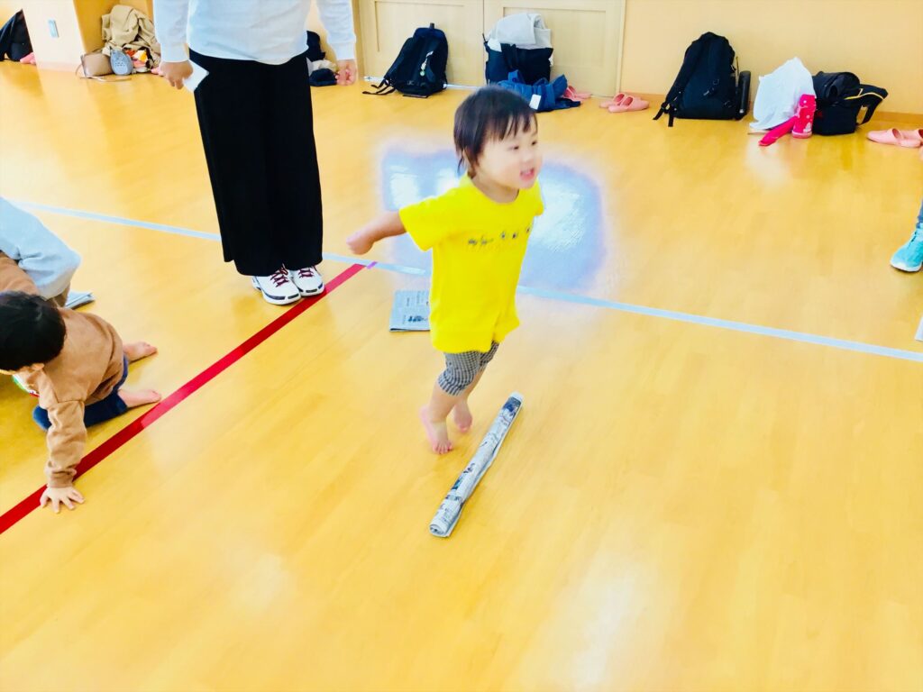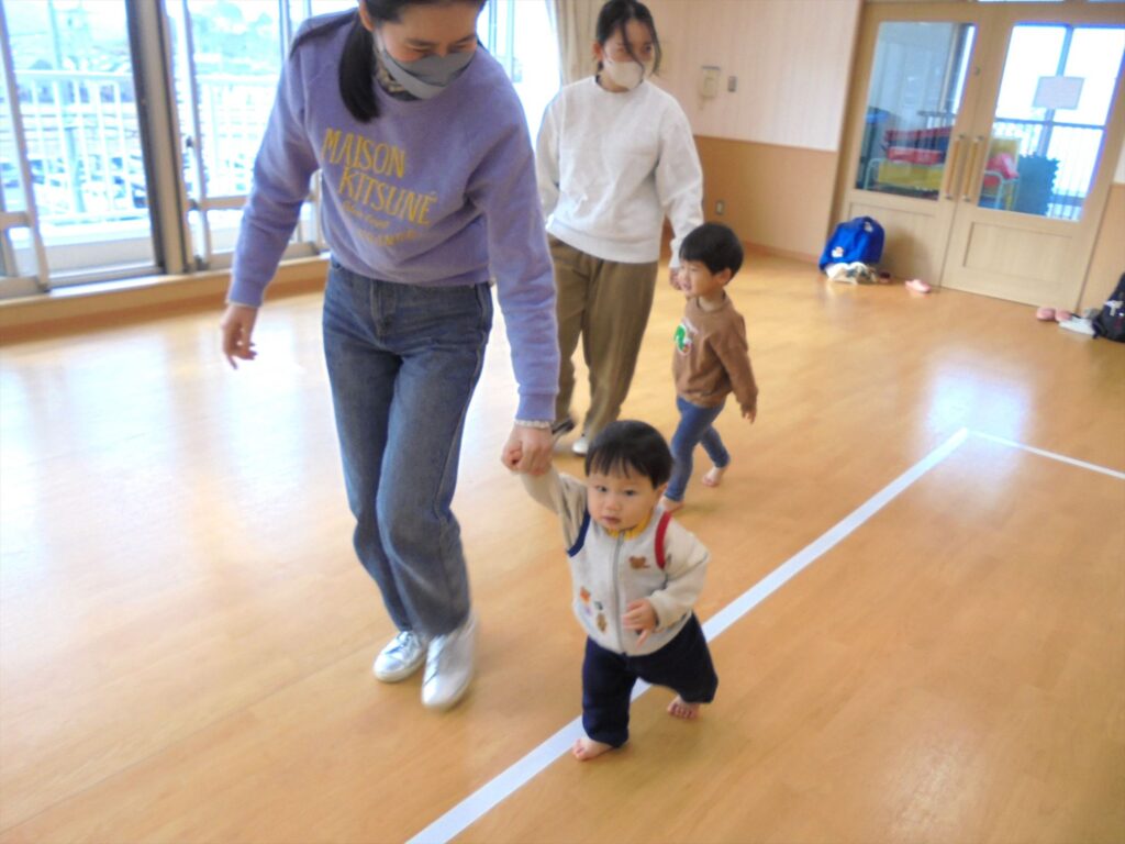 線の上をお母さんと歩くよ。楽しいなぁ~(^^今日は、どんな遊びをするのかな?