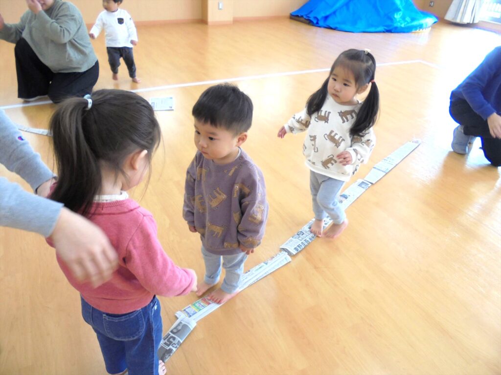 次は、新聞の棒をぺったんこにして繋げて橋渡りに挑戦!!お友達に出会うと「こんにちは!」