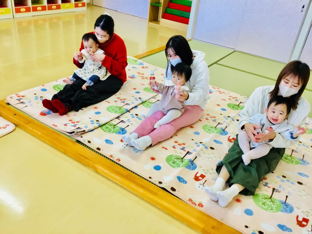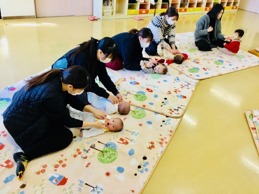「ほっぺおなかぽに~ん♪」のふれあい遊びでは、お母さんにほっぺと、お腹を撫でてもらい気持ちよさそうでした。