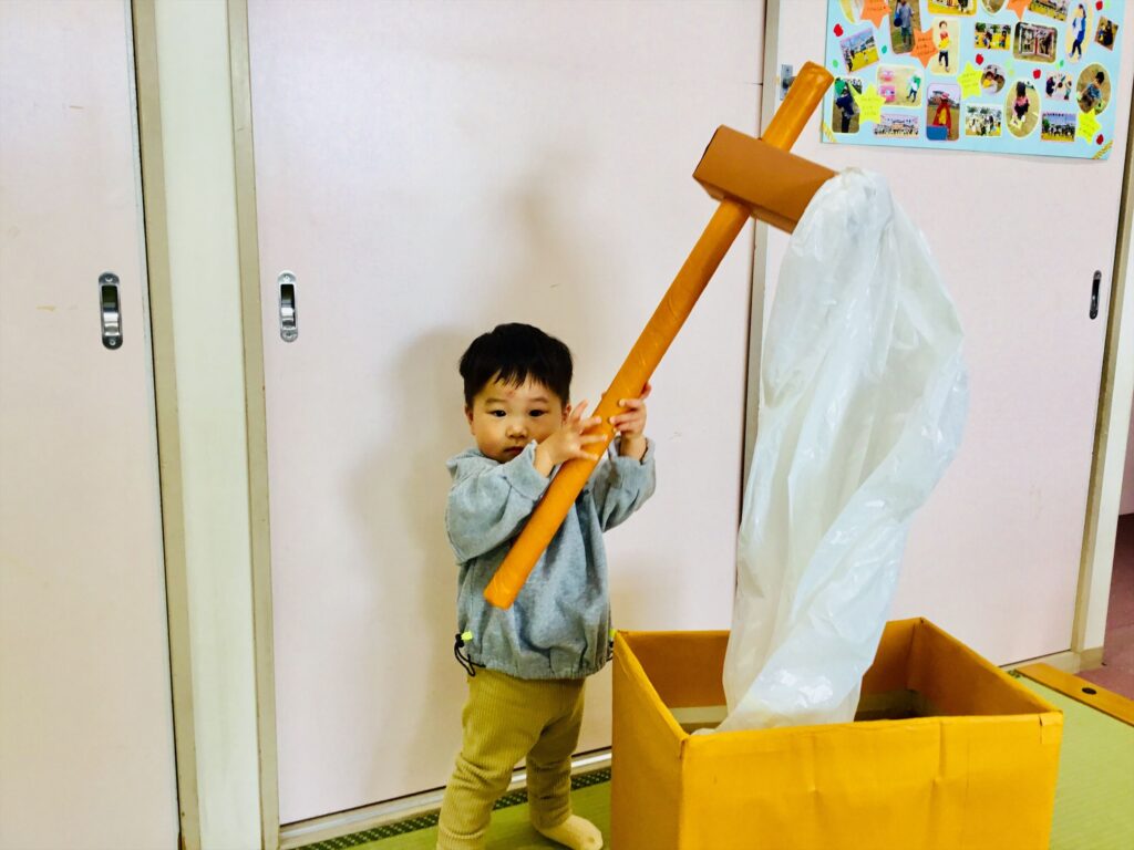 子育て支援ブログ Top 子育て支援 子育て支援ブログ 餅つきごっこ 年末恒例の「お餅つき」をイメージして、今日から餅つきごっこをして遊んでいますよ。 「せ~のっ。」「ペッタン。」 二人で力を合わせて持ち上げると・・・「びよよ~ん。」となが~く伸びた真っ白のお餅が出てきて大興奮!!繰り返し遊んで楽しんでいます。 皆が、健康で過ごせますように(^^♪ 2025.12.16