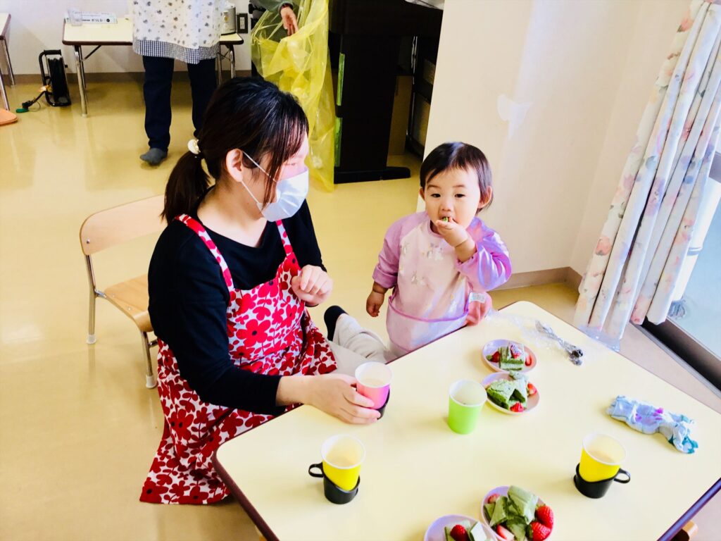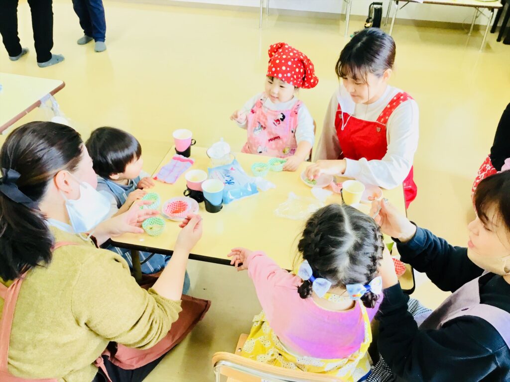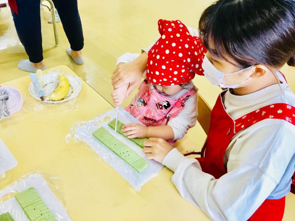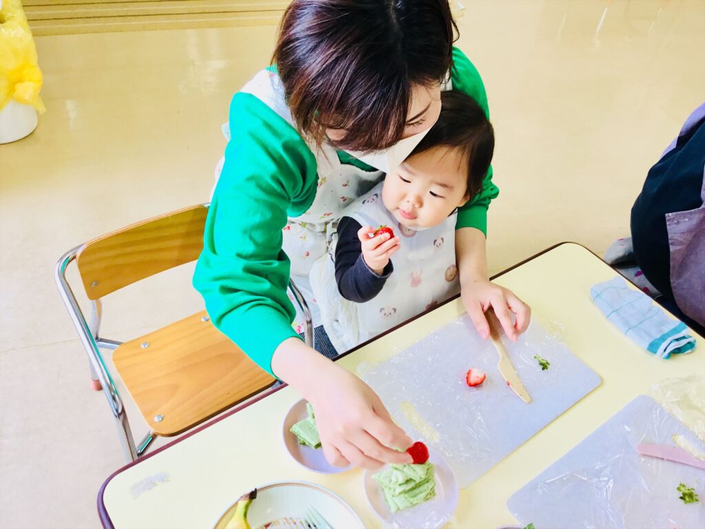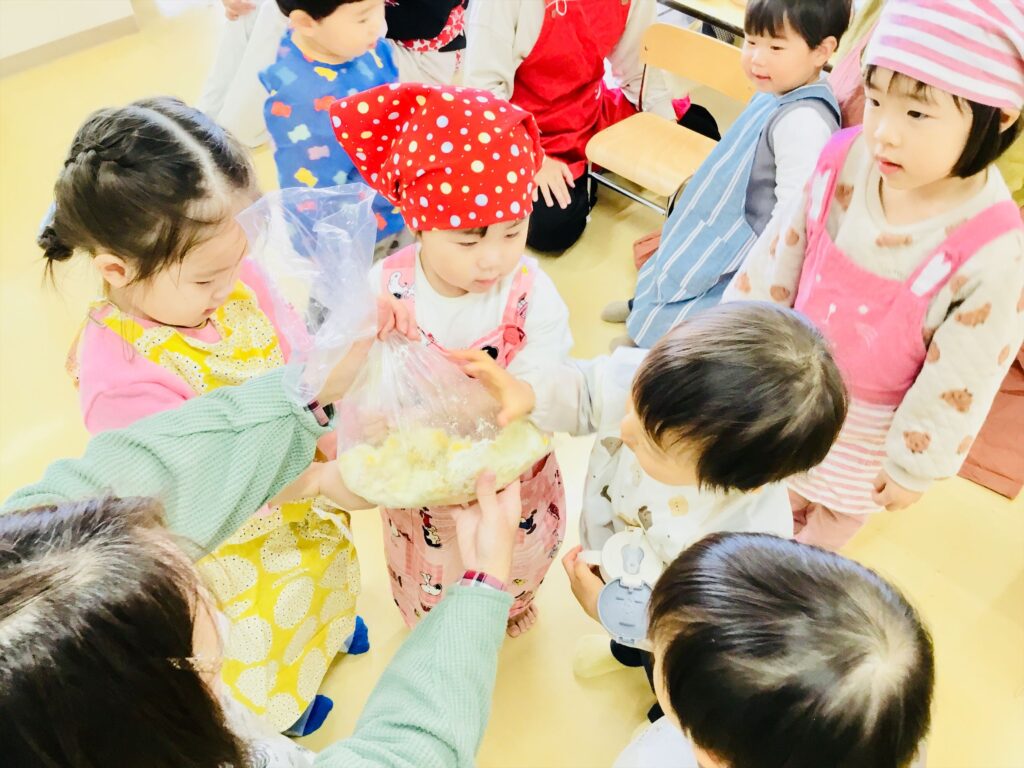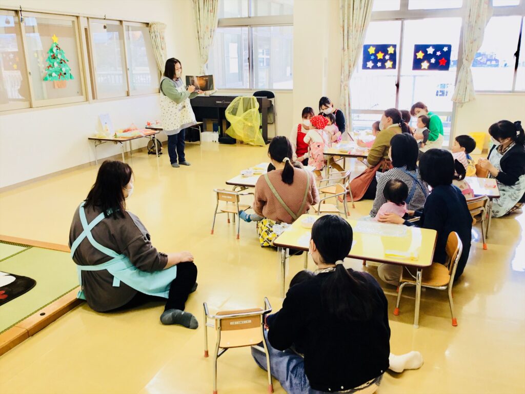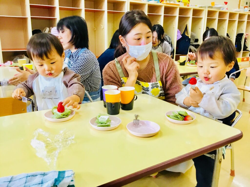 まず始めに、「ケーキ」の絵本の読み聞かせをしました。子ども達が大好きなケーキが出来上がるまでを愛情たっぷりに描いた絵本。出来上がったケーキは、美味しそう~♬思わず手を伸ばして食べるしぐさをするお友達もいましたよ。