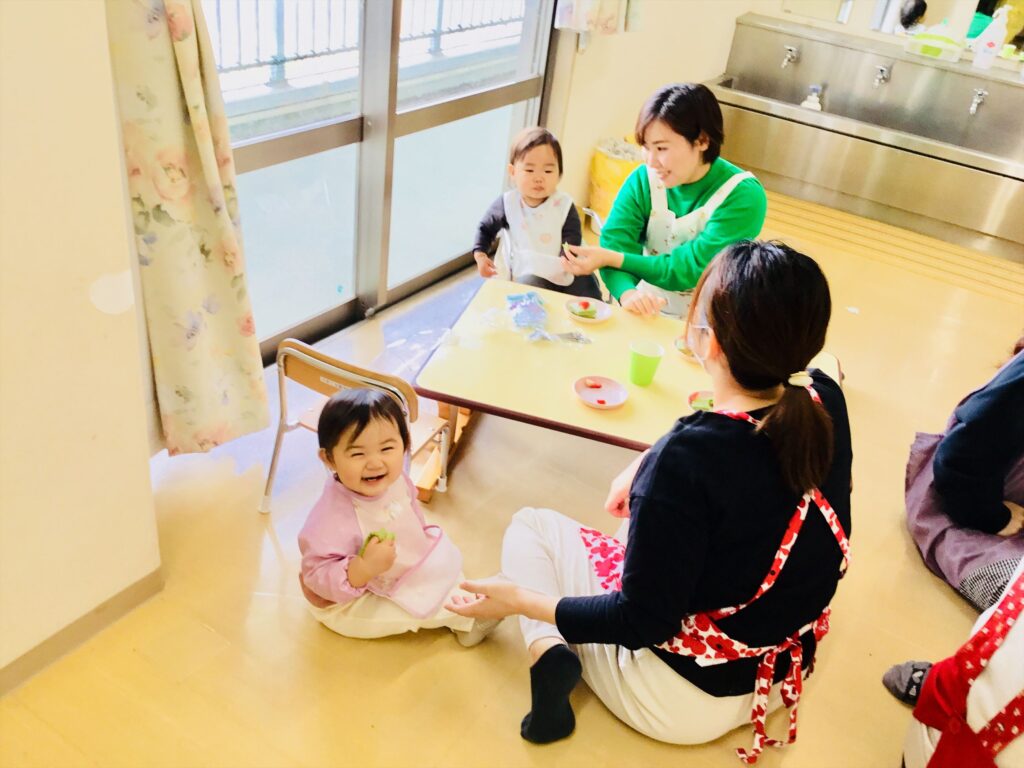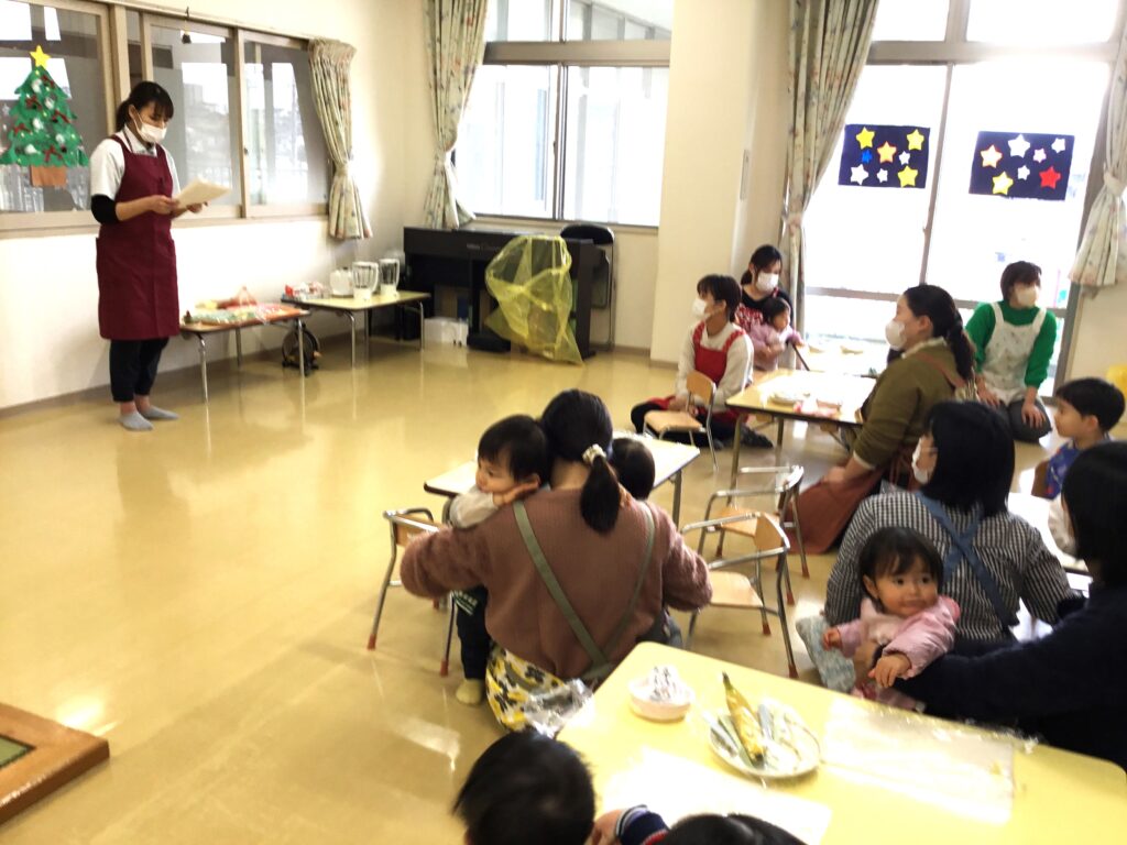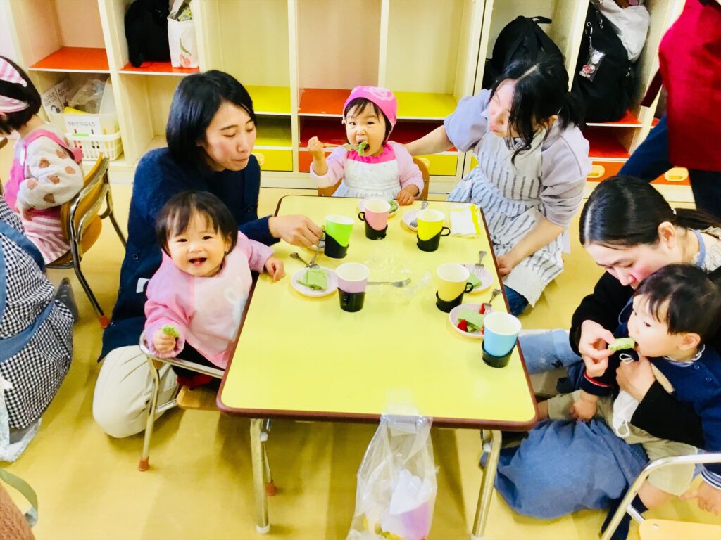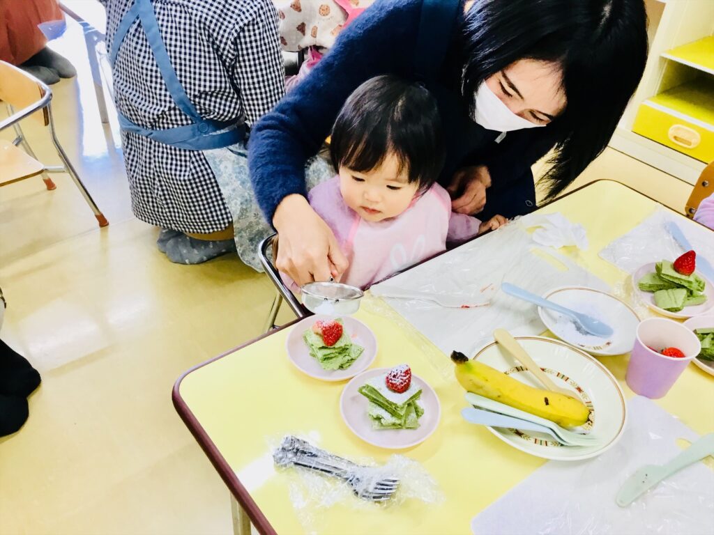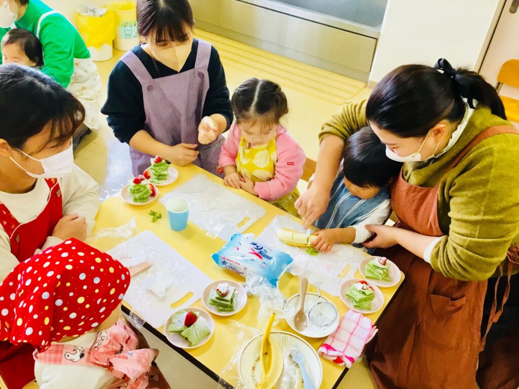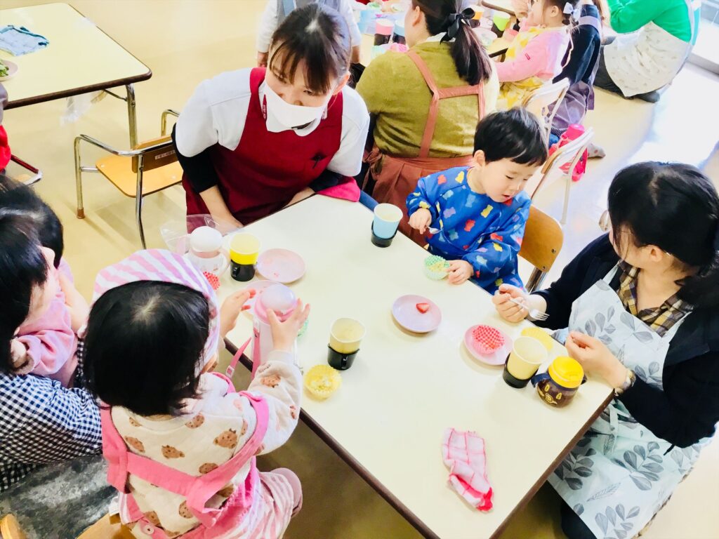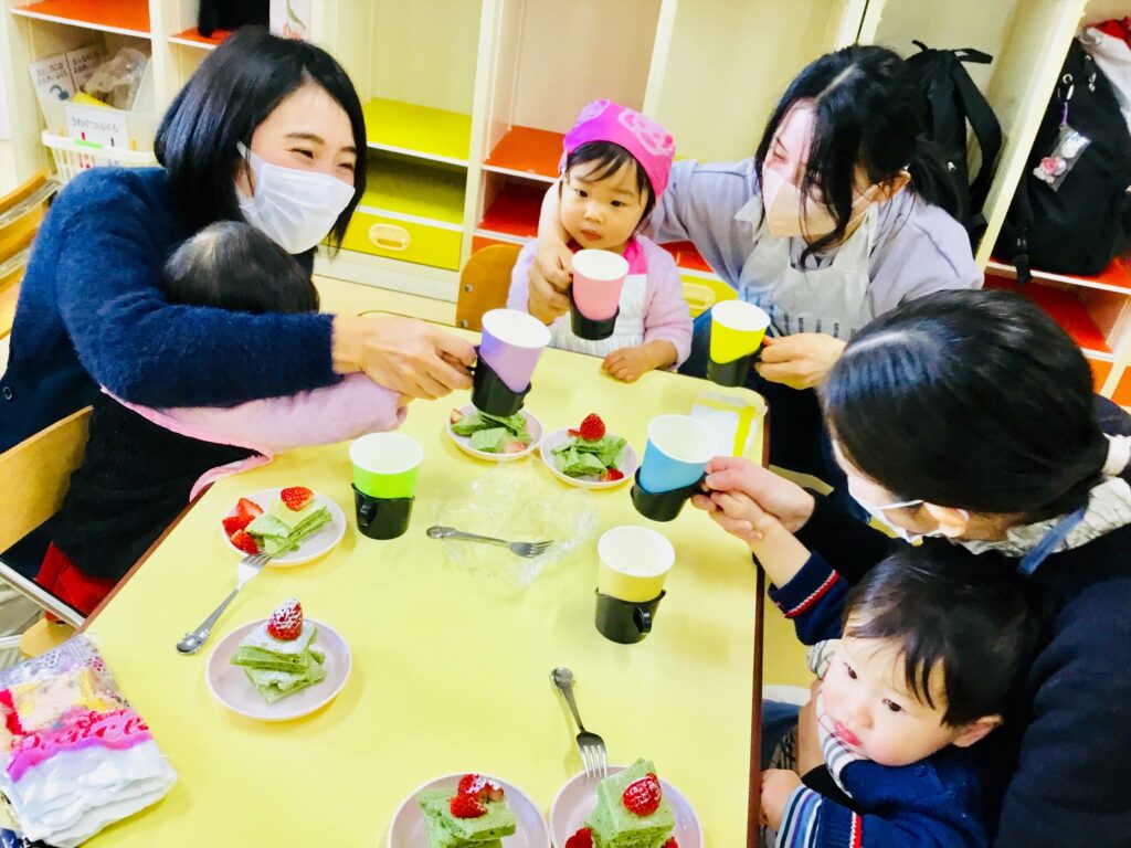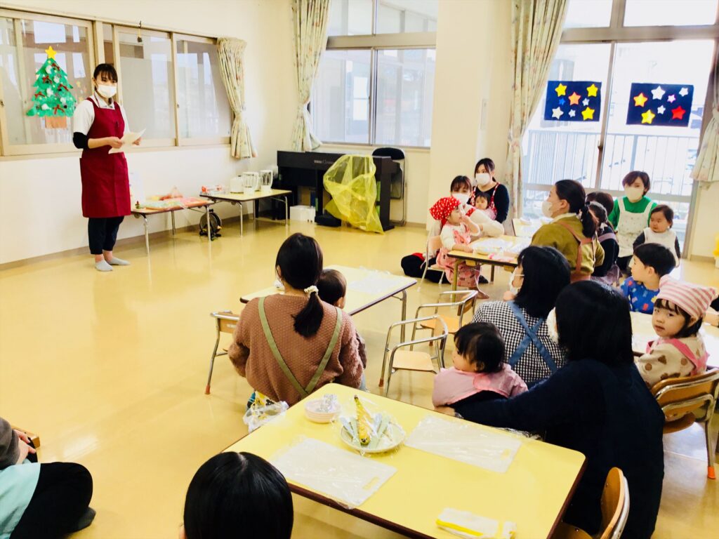 まず始めに、「ケーキ」の絵本の読み聞かせをしました。子ども達が大好きなケーキが出来上がるまでを愛情たっぷりに描いた絵本。出来上がったケーキは、美味しそう~♬思わず手を伸ばして食べるしぐさをするお友達もいましたよ。