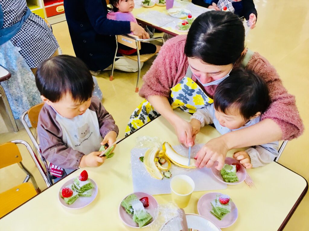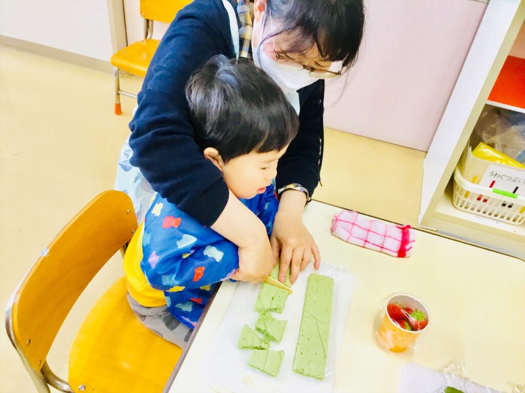 お母さんに手を添えてもらって、切ってにっこにこ~(^^♪