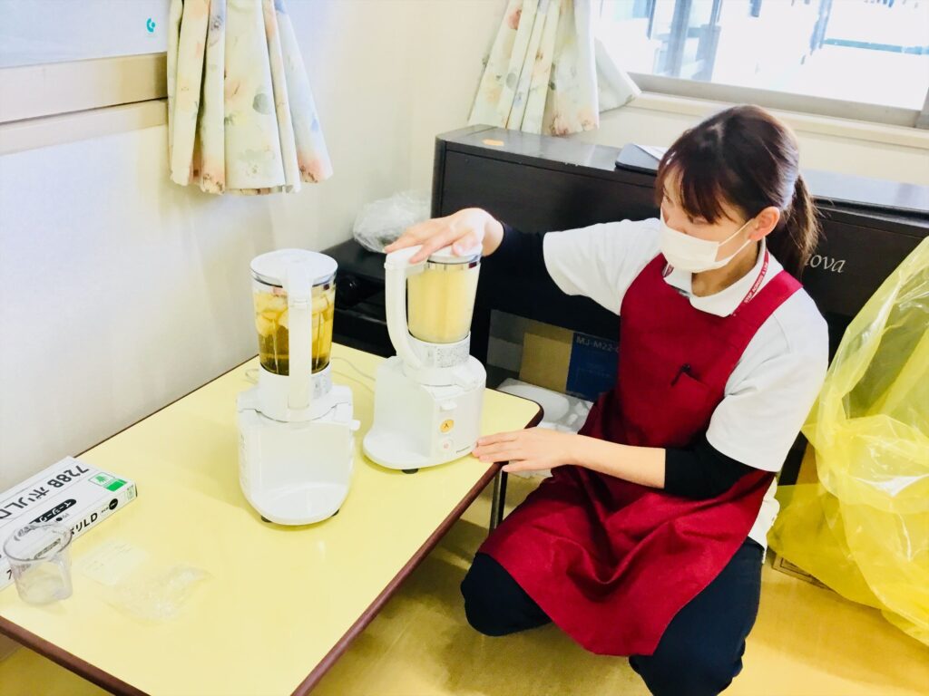 みんなが切ったバナナとPOMりんごジュースをジューサーに入れると・・・・ミックスジュースの完成!!