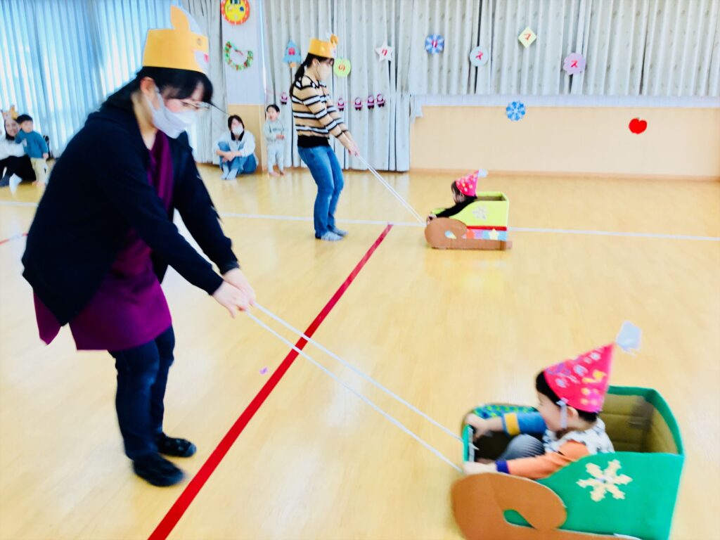 次は、大好きなぬいぐるみをそりに乗せてお友達と引っ張りました。お友達と協力して顔を見合わせてニッコリ(^^♪
