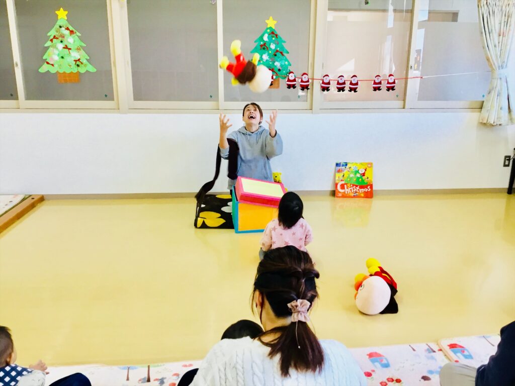 12月19日(金)、英語の音遊び♬を行いました。松山認定こども園星岡には、専任英語講師が在籍しており、在園児は遊びの中で英語に触れる環境で生活しています。