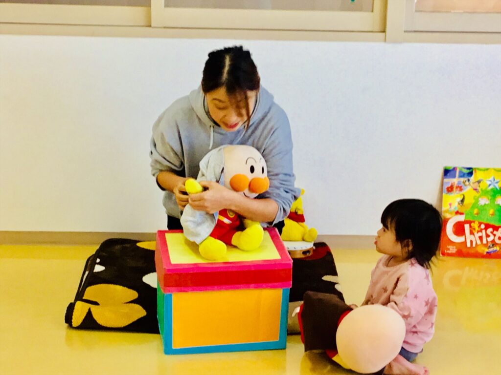 カラフルな箱が出てきましたよ。何が入っているのかな?英語の先生が魔法の言葉を言い始めると・・・アンパンマンが飛び出してきて、ビックり!!子ども達は、興味を示しだしわくわく、ドキドキ☆