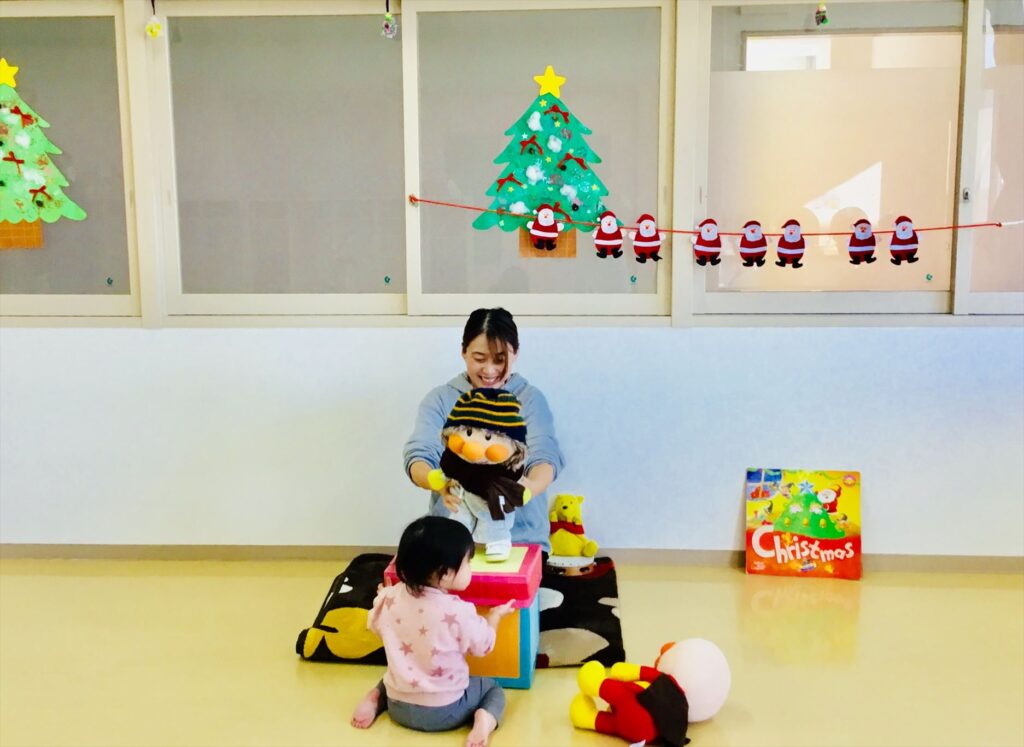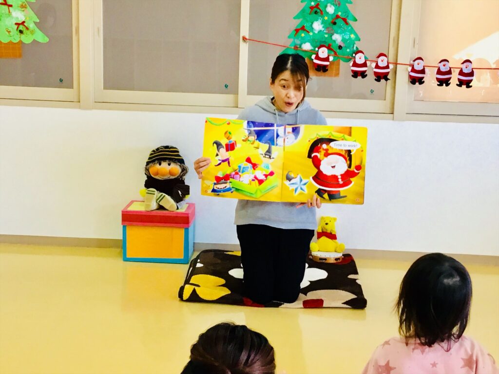 絵本「christmas」の読み聞かせです。クリスマスツリーに少しずつ飾りが増えてくると皆、興味を示して夢中になって見る姿があり色彩豊かな絵とお話に釘付けでした。