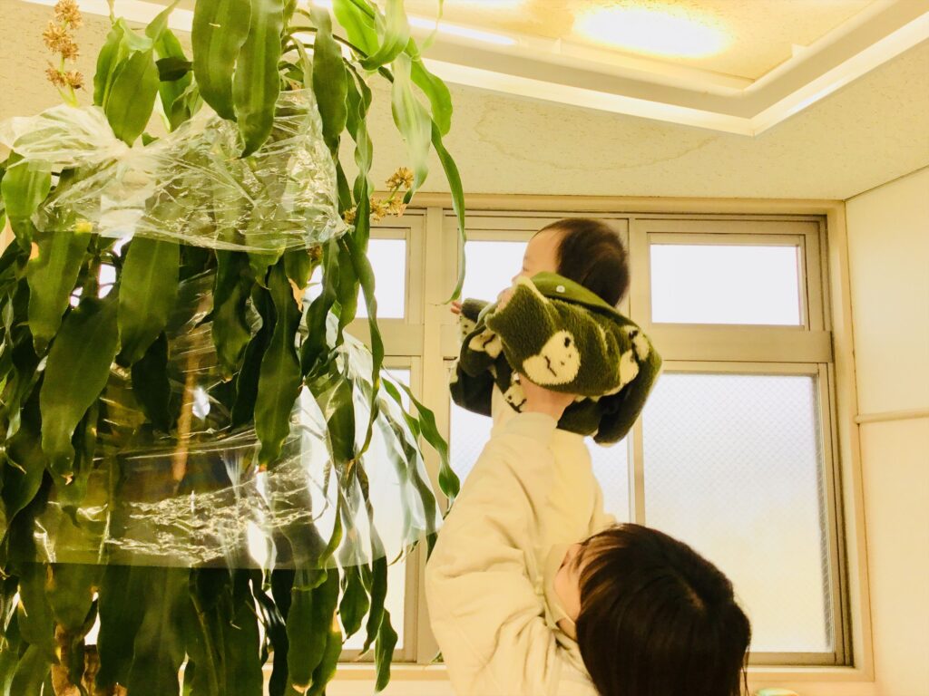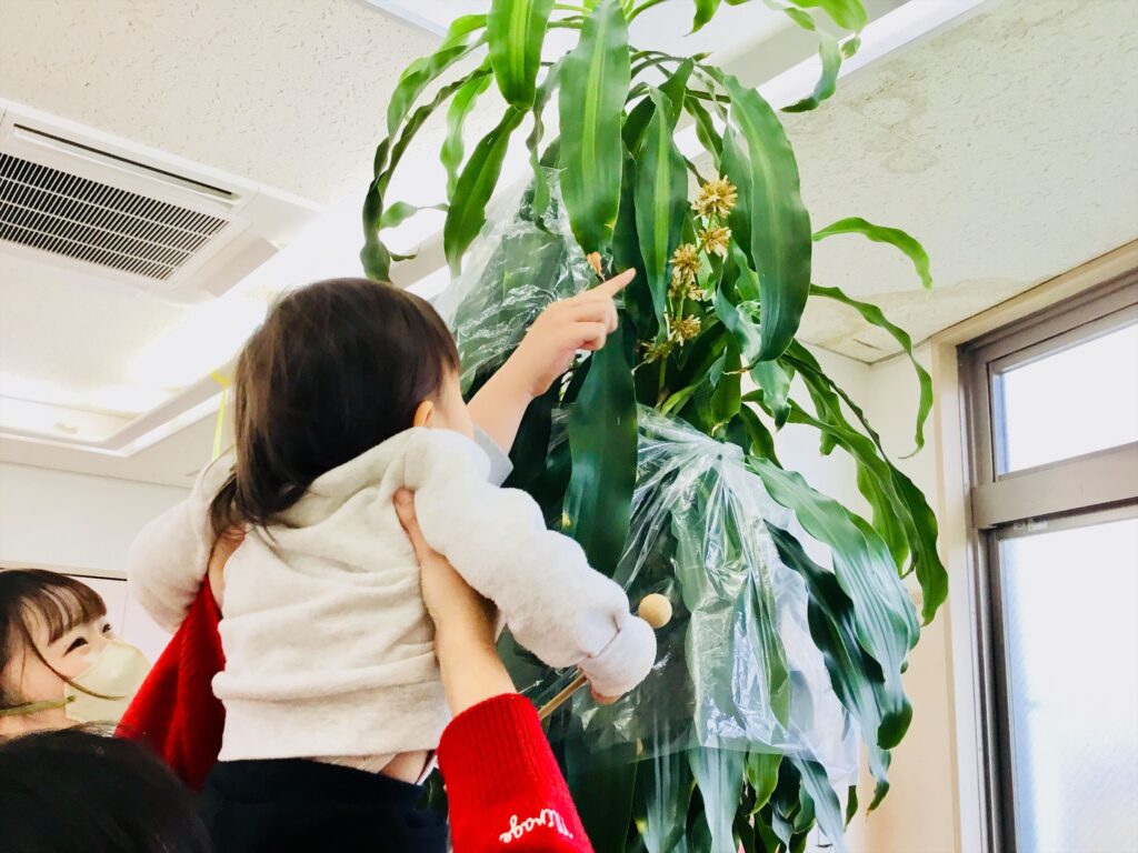 遊びに来ると、お母さんに抱き上げてもらって花の観察をして嬉しそう♪爽やかな香りも感じながら奇跡の花を眺めて和やかに過ごしました。