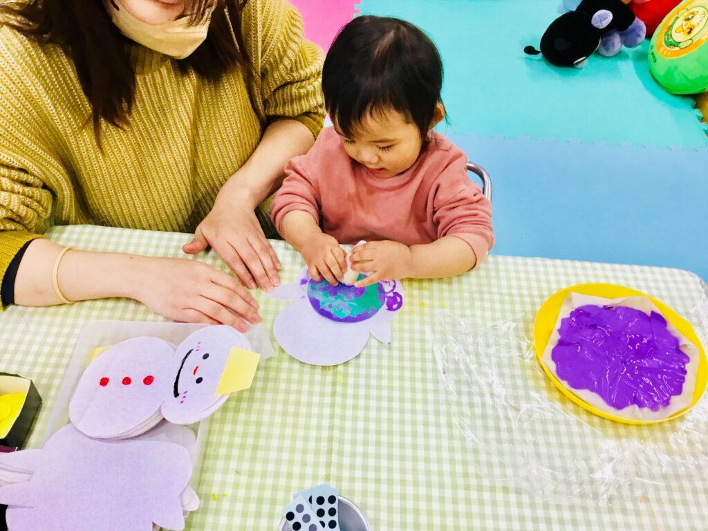 ペタペタ、両手でフィンガーぺイントを楽しんでいますよ。