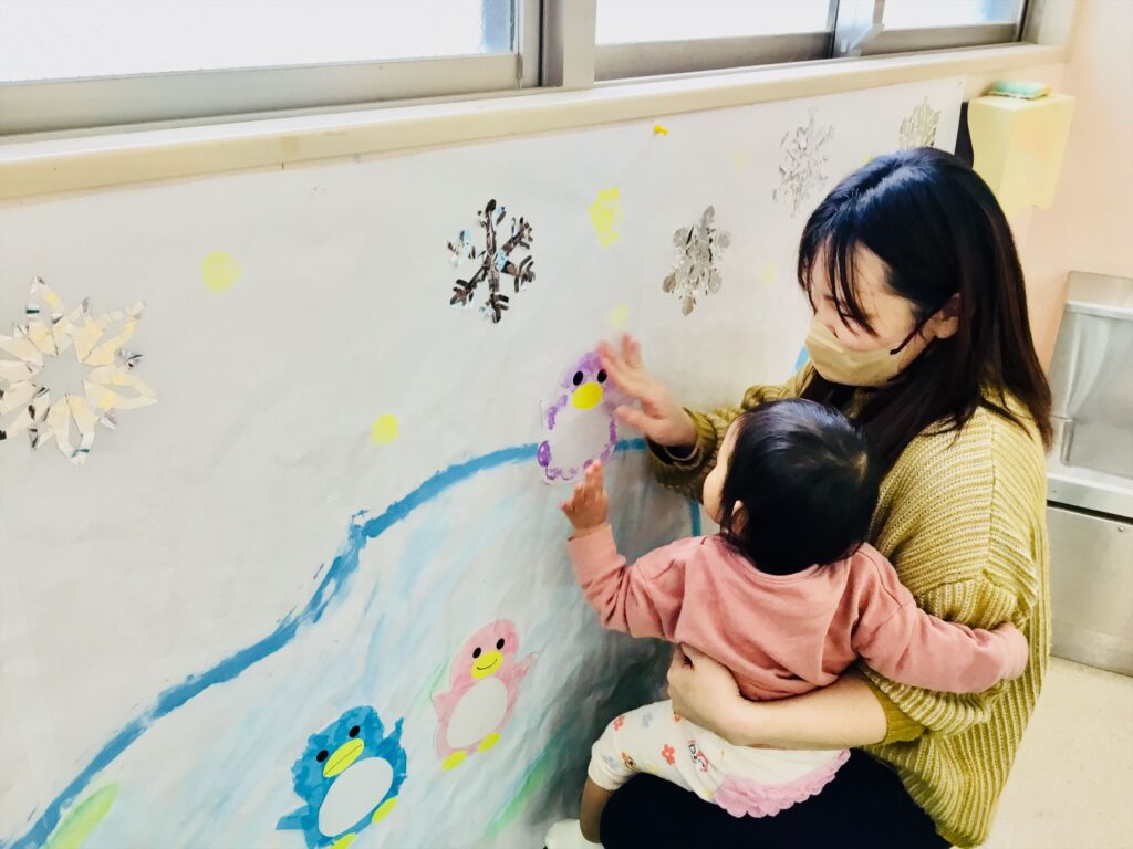 今日から氷の山の壁面が登場しています。目と口ばしを貼ると可愛いペンギンの完成!!壁面に貼ると・・・ペンギンさんが氷の山で遊んでいるみたいですよ。いろいろな素材にふれて遊びましょう。