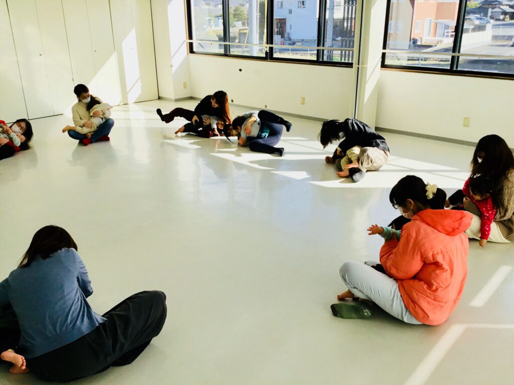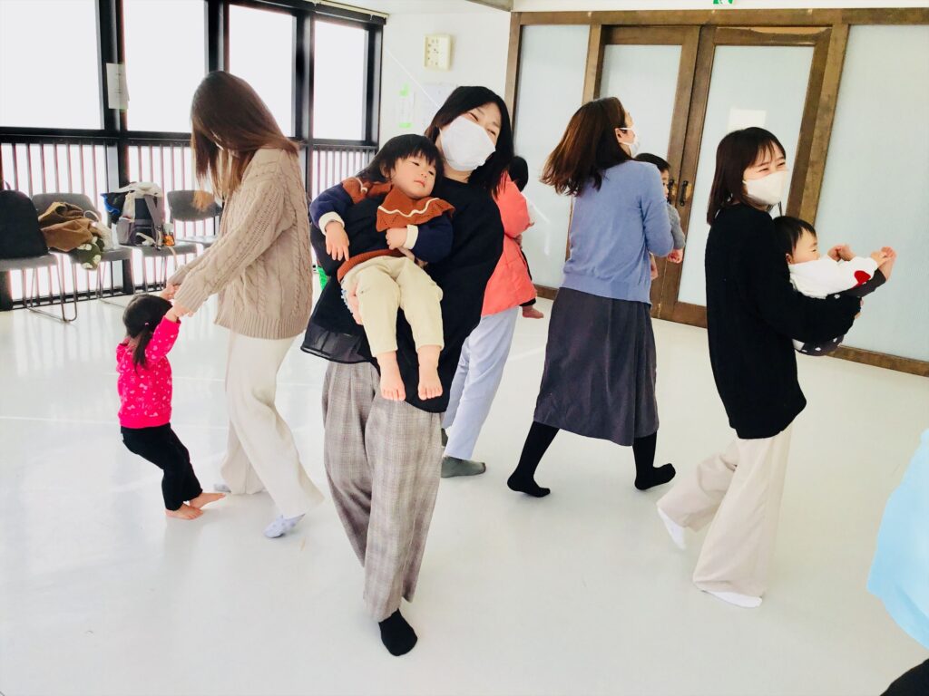 続いて、わらべ歌「おしくらまんじゅう」をしました。お母さんは、子どもを抱っこして、おしくらまんじゅう押されて泣くな!!