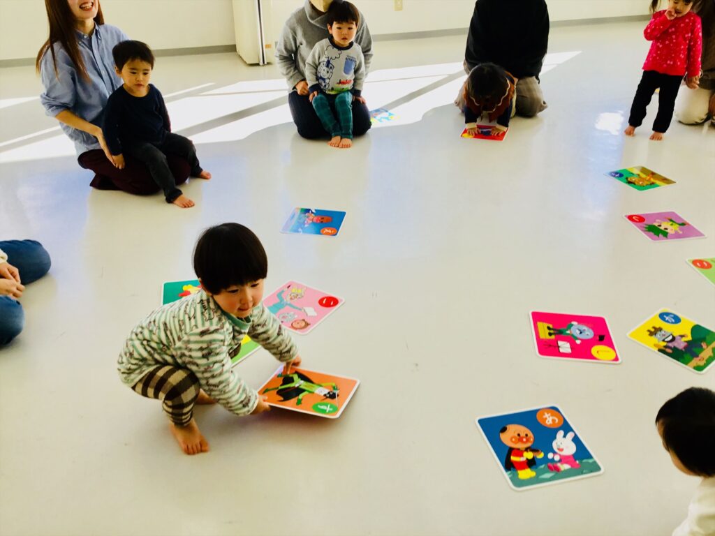 大きく広がった輪の中に、大きなカードが並び、「うわぁ~。アンパンマン!!」と声を出す子もいましたよ!これから、どんな遊びをするのかな?わくわく気分でスタートです♪