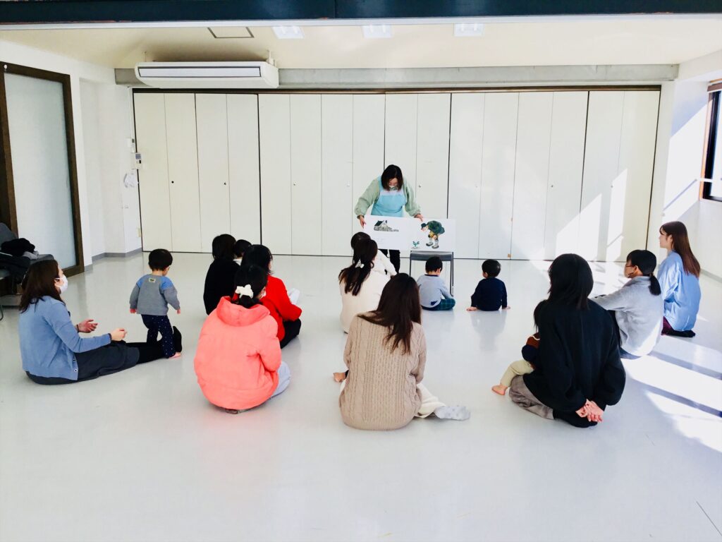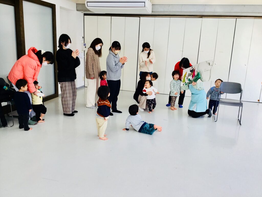 最後は、お母さん達も一緒に後ろに続いて皆で、「うんとこしょ。どっこいしょ。」と言いながら引っ張る動作をすると・・・大きなかぶが抜けて手を叩いて喜びました。お話の世界に引き込まれて楽しかったですね☆