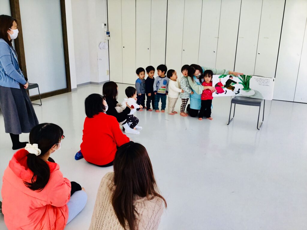 最後は、大型絵本「おおきなかぶ」の読み聞かせです。「うんとこしょ。どっこいしょ。」「それでもまだまだ、抜けません。」