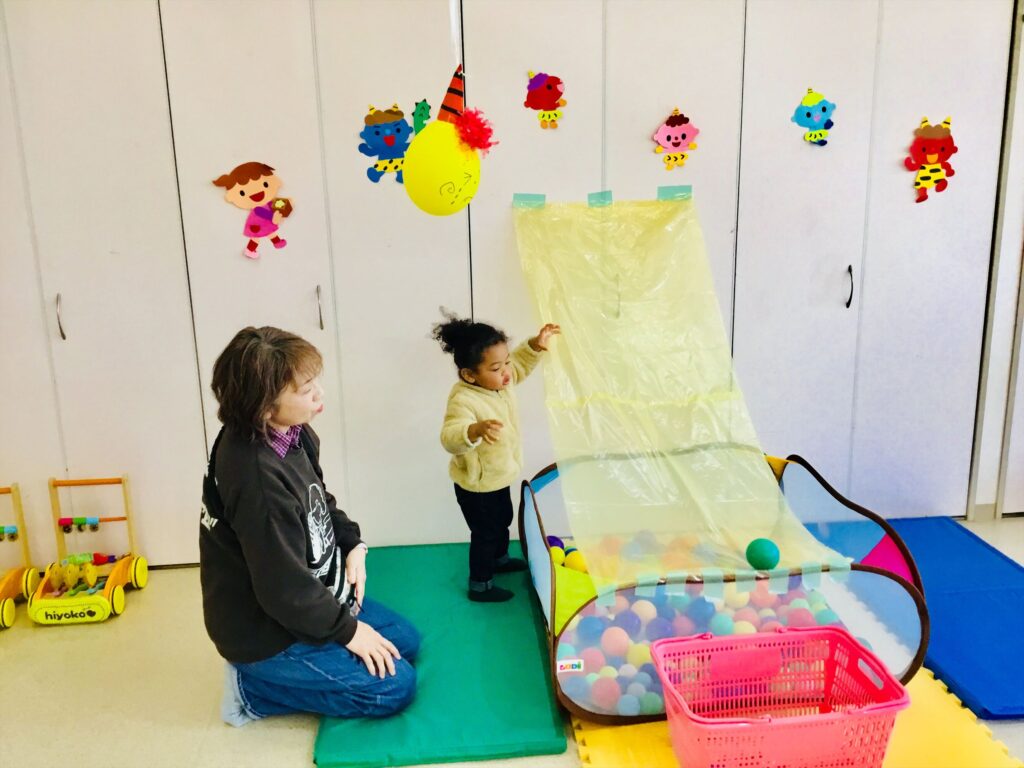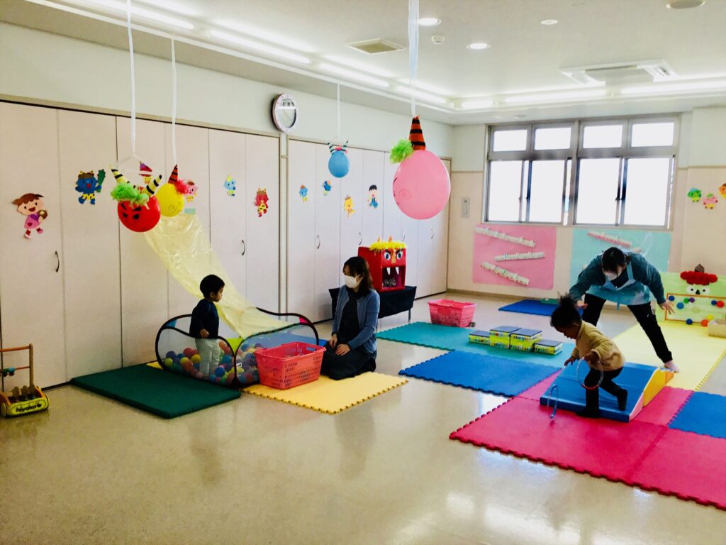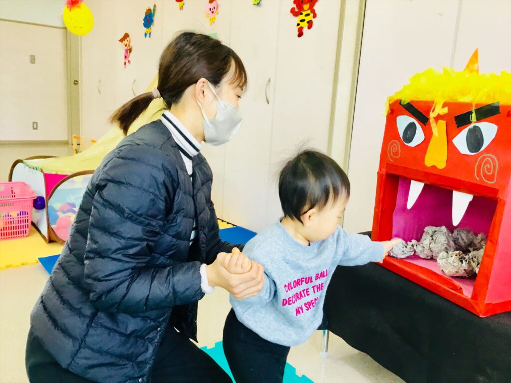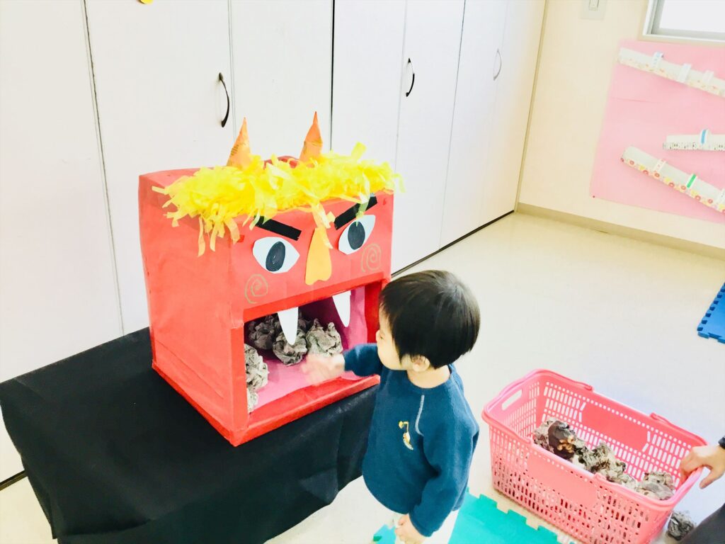 もうすぐ節分です。今日から、支援センタールーム前広場に『豆まきごっこ』の環境が登場!!