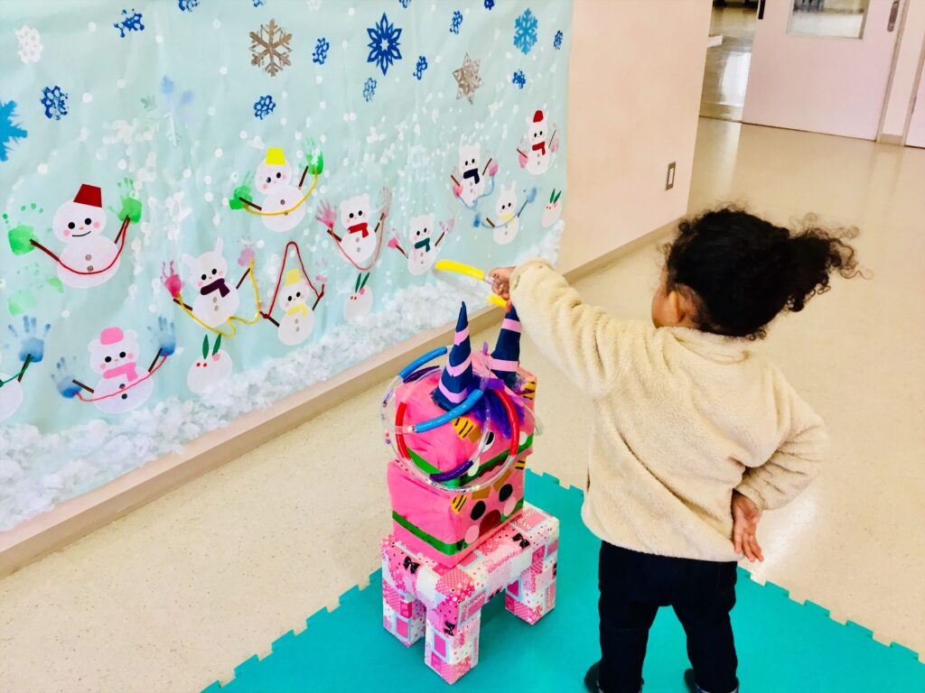 リングをそうっと、鬼の角に入れて輪投げも楽しんでいますよ。