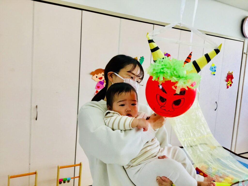 鬼の風船がゆ~ら、ゆら。お母さんと一緒に触れて鬼の顔が近づいてくると・・・ビックリ!!