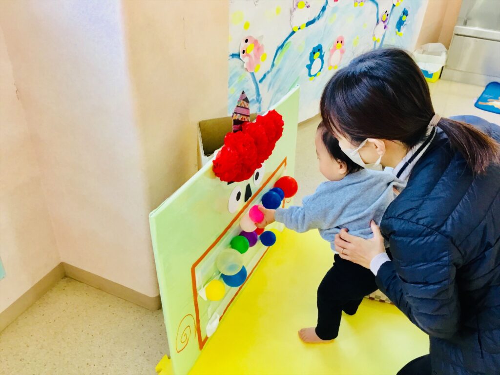 鬼の口がカラフルになってきていますよ。ボールを貼ったり、取ったりを楽しんでいます。