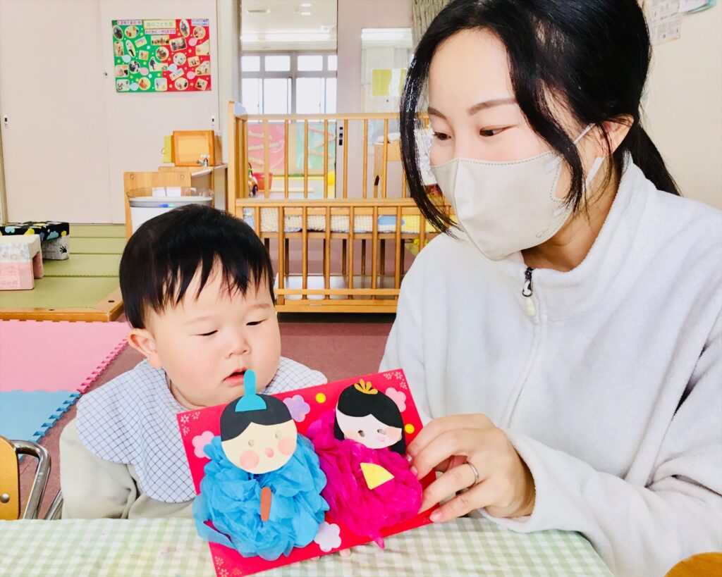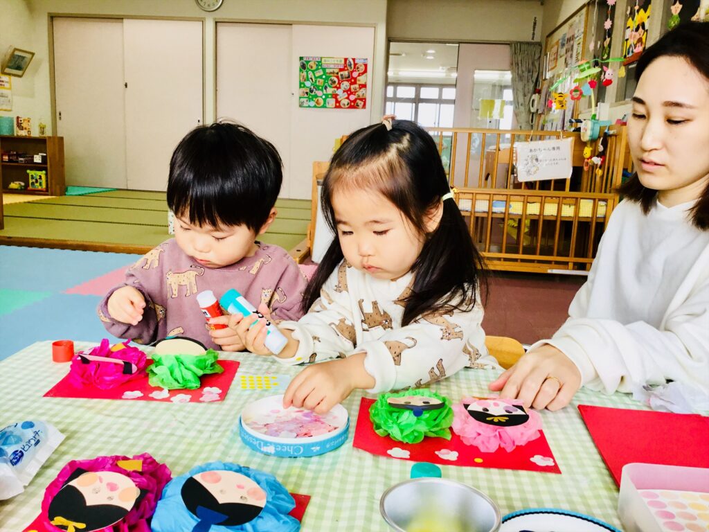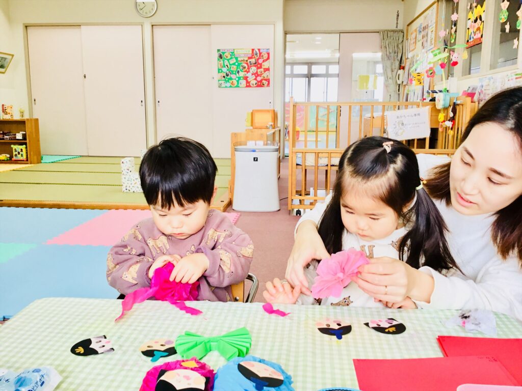 子育て支援ブログ Top 子育て支援 子育て支援ブログ 雛飾りを作っているよ♬ もうすぐ「桃の節句」です。 今日から雛飾りを制作しています。お内裏様とお雛様の顔は、子どもの指でスタンプをしています。オリジナルの可愛い表情になっています。 お花紙を手先を使って開けていますよ。薄い紙なので、そうっと、そうっと広げていましたよ。 広げた花紙は、着物になります。冠や桃の花を飾り、華やかになっています。 完成!!とても可愛い雛飾りが出来ました♬行事の無い日に制作をしています。オリジナルの雛人形を作ってみませんか?ご来園お待ちしております。 2026.02.16