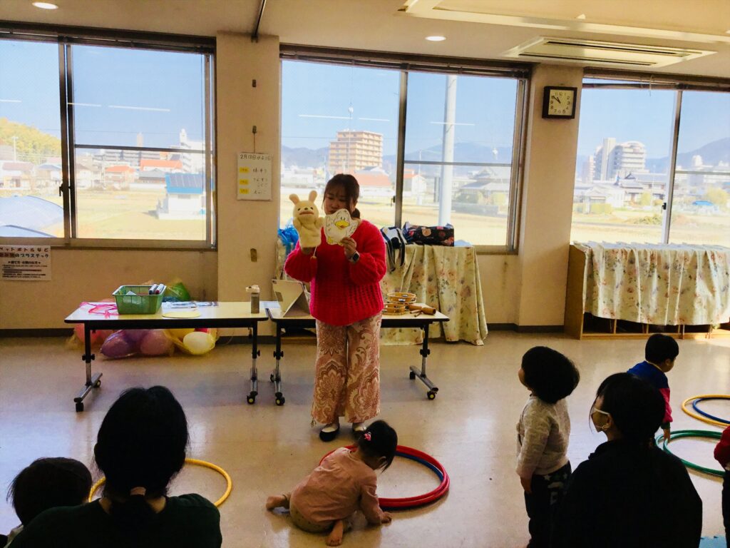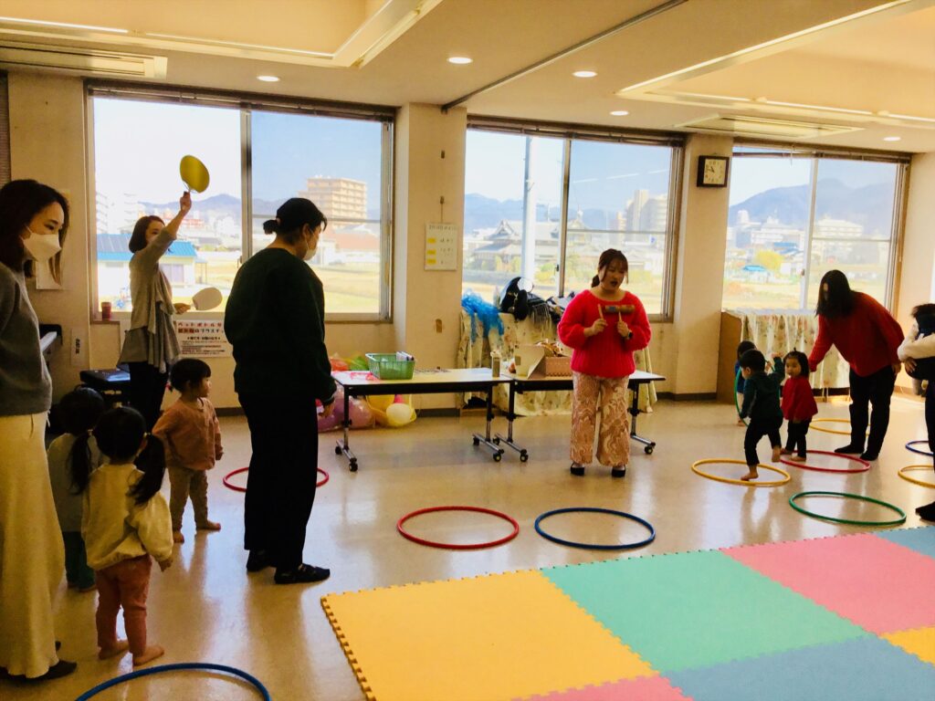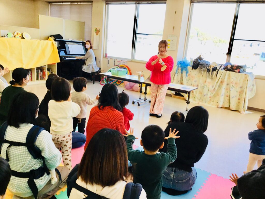 松山認定こども園星岡では、毎月声楽家の清水美千子先生とピアニストの豊田瑞代先生をお迎えして音楽集会を実施しています。今日は、子育て支援センターにて親子で楽しめるリズム遊びを教えて頂きました。