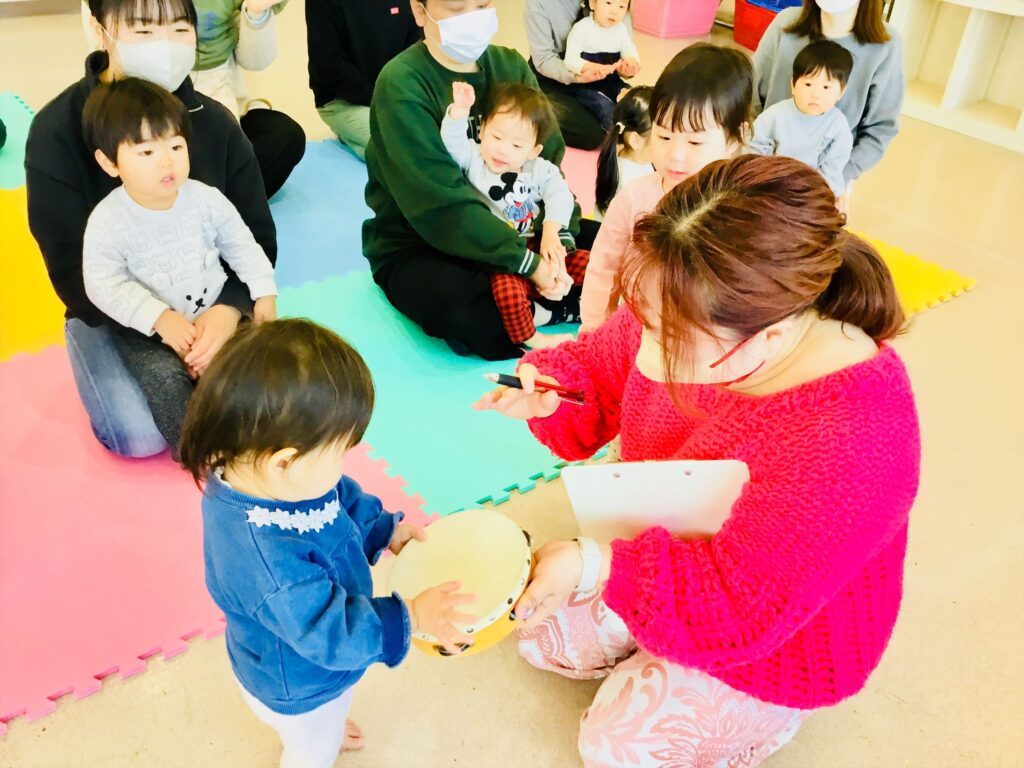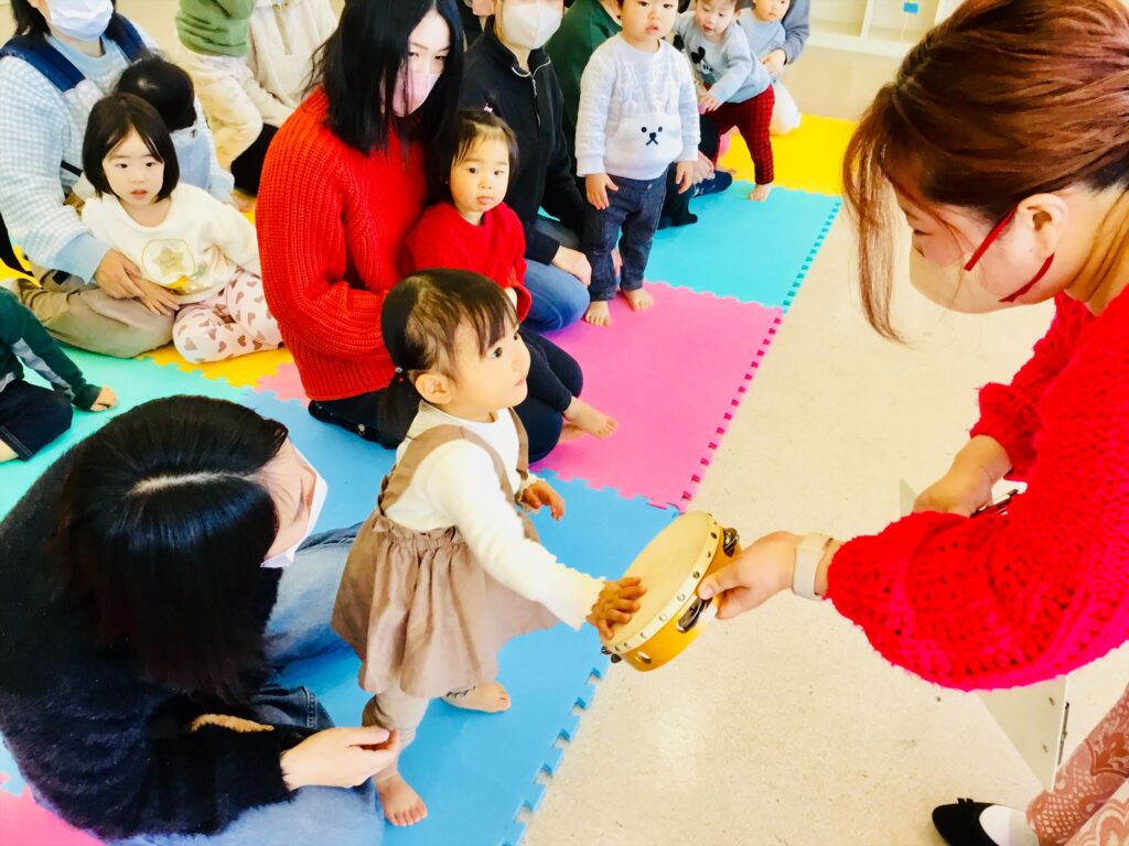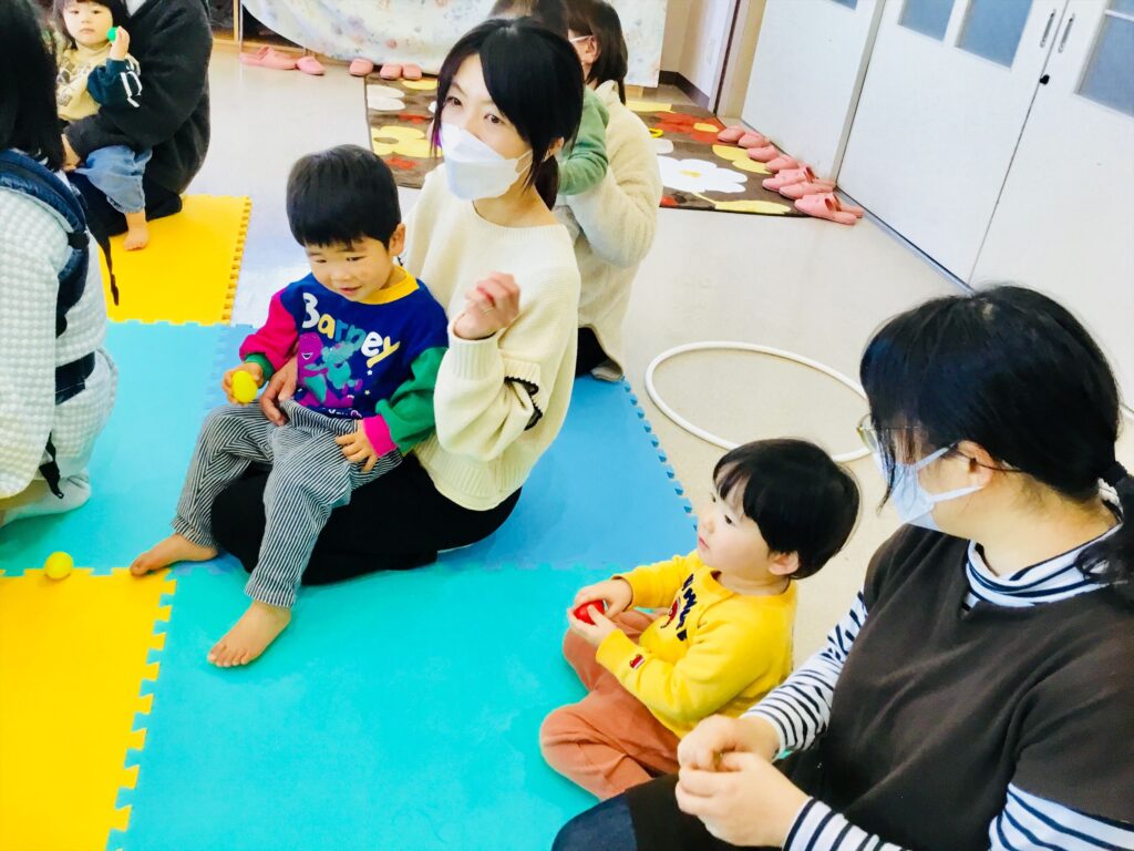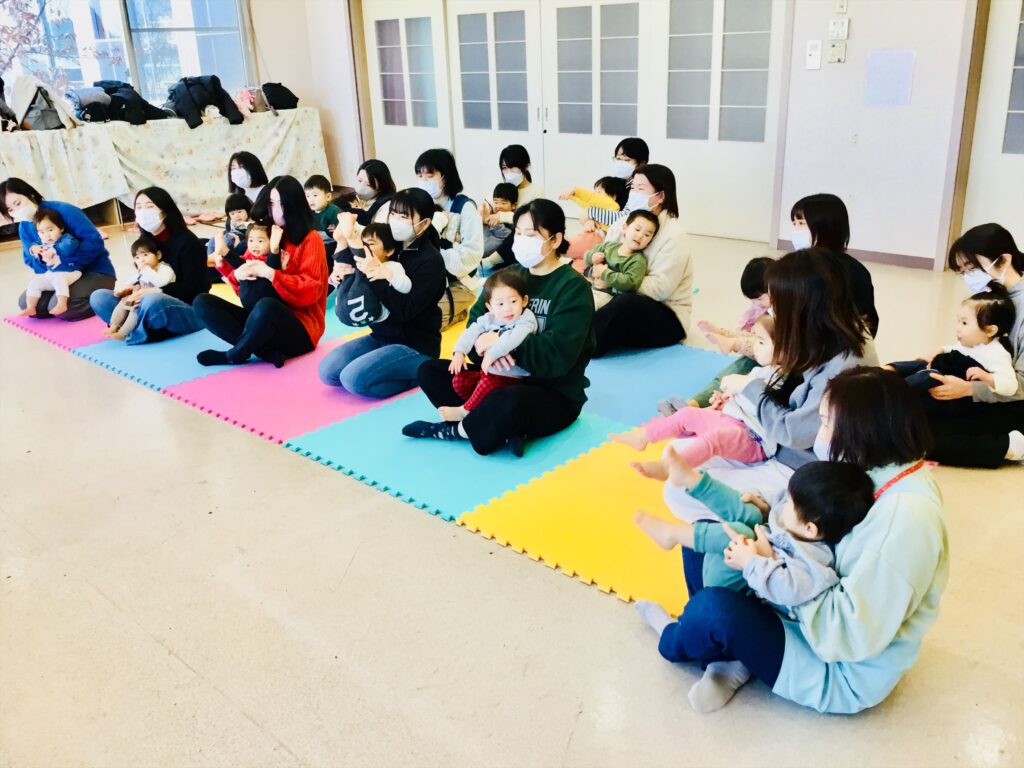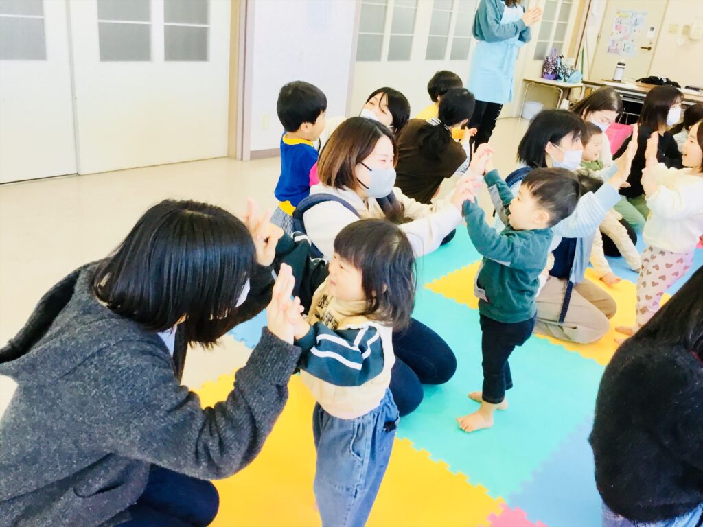 家庭でも出来る簡単なリズム遊びと表現遊びをして有意義な時間を過ごしました。馴染みのある季節の歌やわらべ歌も家庭でも口ずさみ楽しんで下さいね。毎月、音楽集会を実施しています。在園児の集会を2階テラスより見学しながら一緒にリズム遊びも楽しめます。興味のある方は実施日をお知らせしますので、職員に声をかけて下さいね。