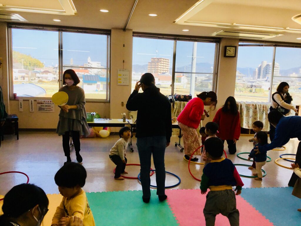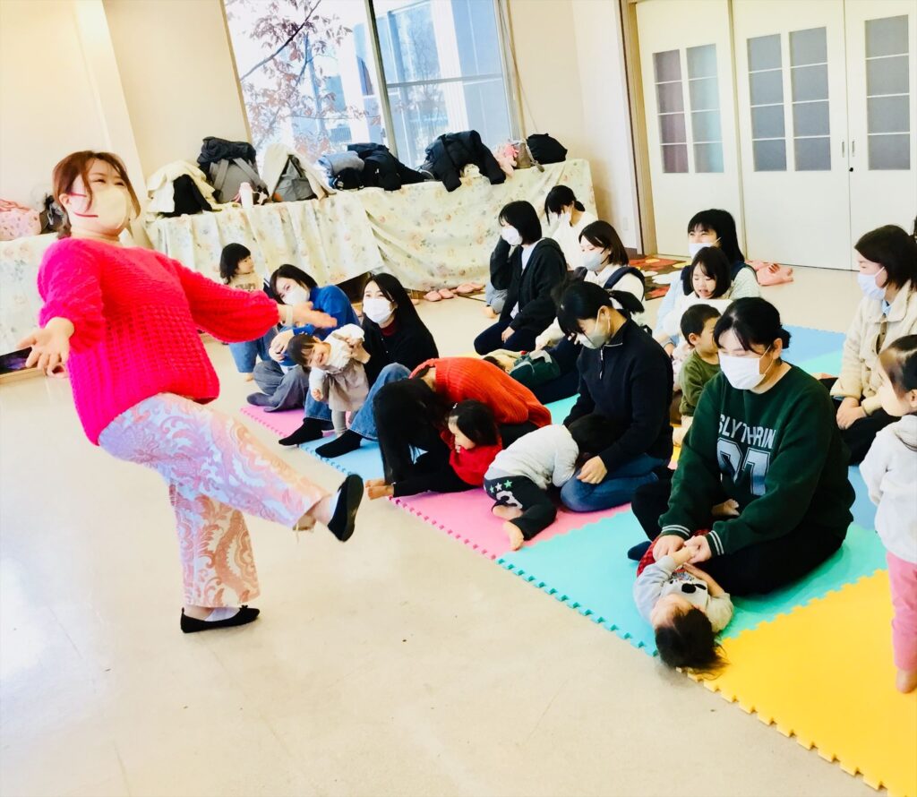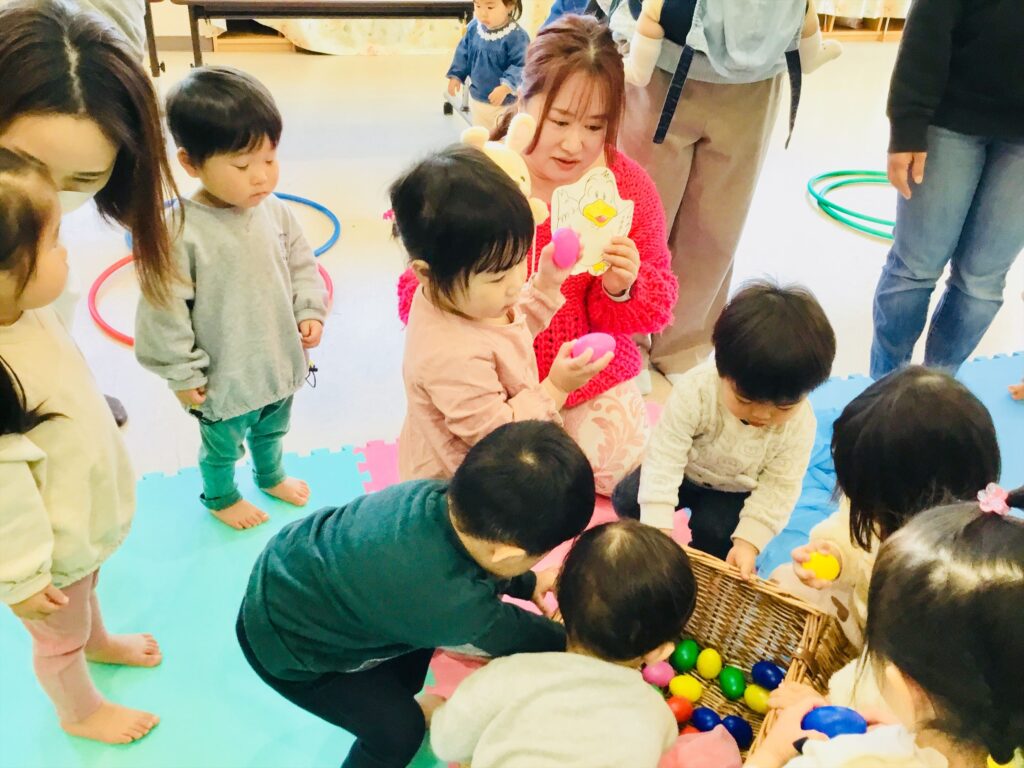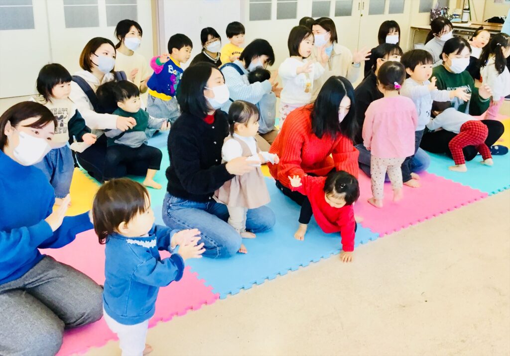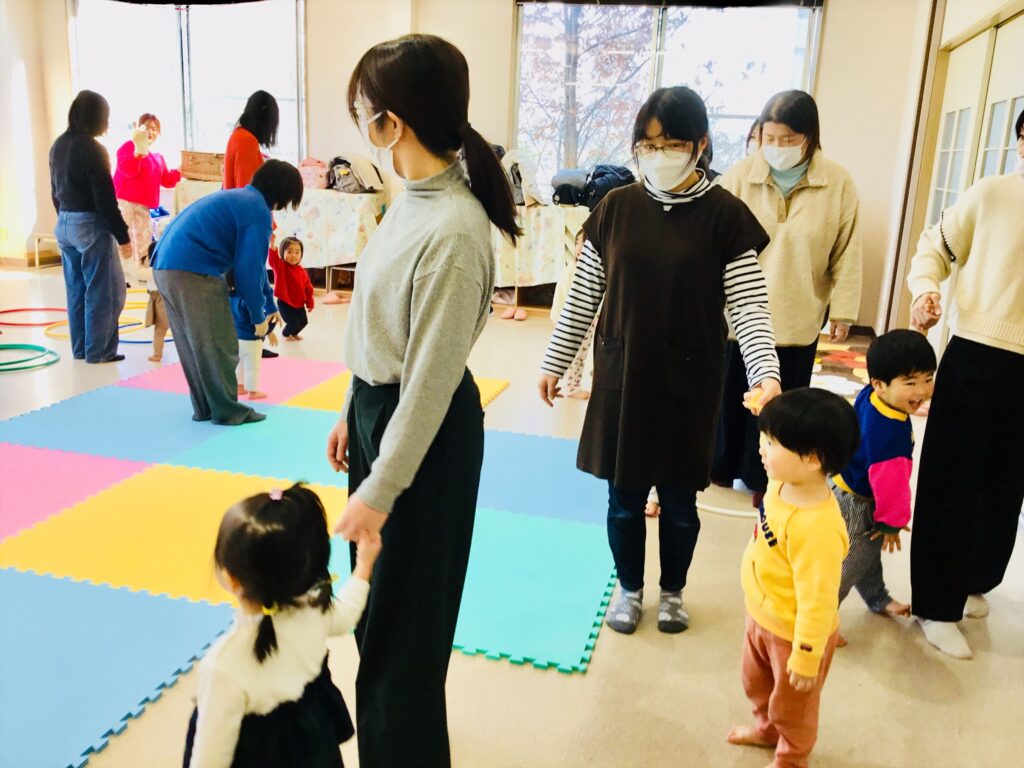 家庭でも出来る簡単なリズム遊びと表現遊びをして有意義な時間を過ごしました。馴染みのある季節の歌やわらべ歌も家庭でも口ずさみ楽しんで下さいね。毎月、音楽集会を実施しています。在園児の集会を2階テラスより見学しながら一緒にリズム遊びも楽しめます。興味のある方は実施日をお知らせしますので、職員に声をかけて下さいね。