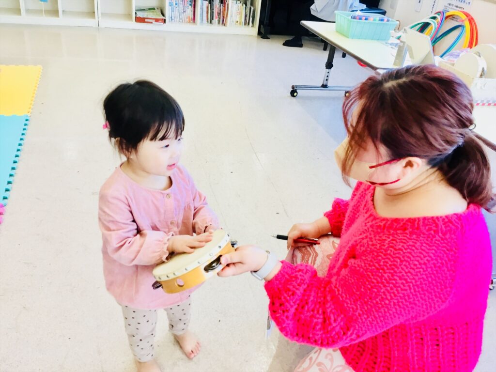 一人ずつ名前を呼ぶと・・・「はぁい。」のリズムに合わせてタンバリンを叩きました。